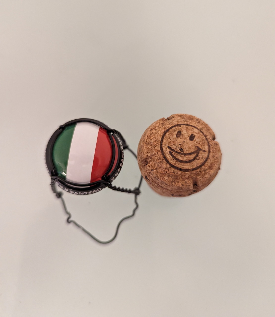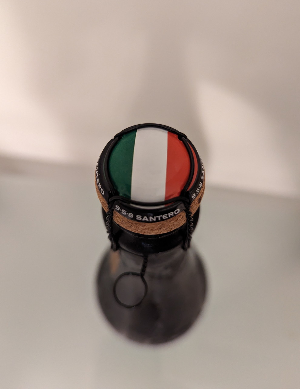 近所の酒屋で何気なく買ったイタリアのスパークリングワイン「サンテロ ブラック ブリュット」のキャップシールをはがすとちょっと可愛かったので、思わず写真に撮ってしまいました。