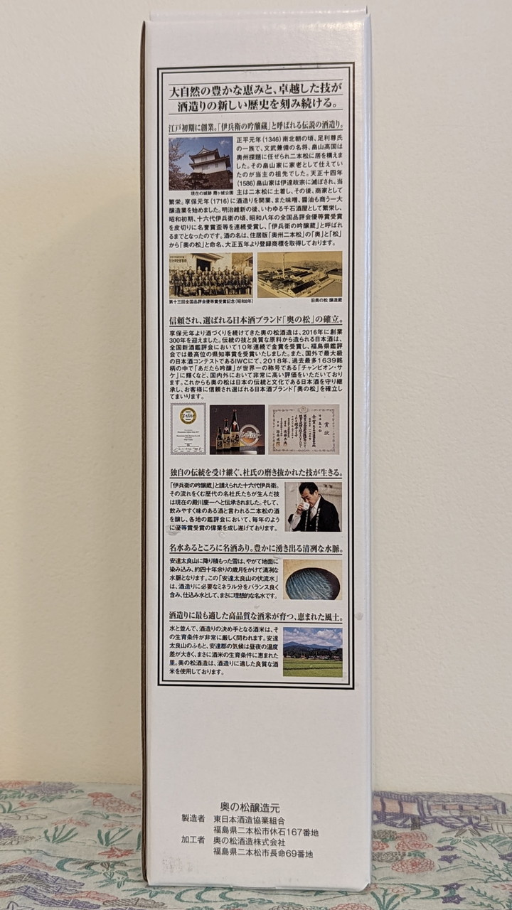 化粧箱の裏面には、奥の松酒造のこだわりがプリントされています。