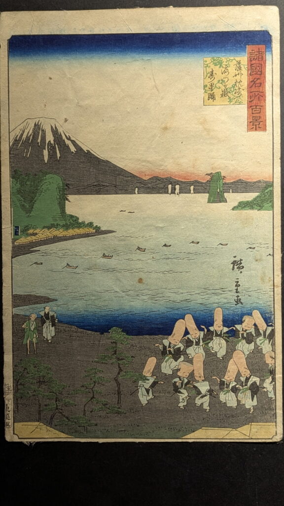 描かれている富士山自体には雪がなく初夏の様子ですが、湖面に映る富士には雪が描かれるという、北斎らしい独自の表現が見られます。