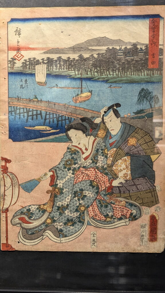 風景描写を得意とした広重が背景の「吉田大橋」を描き、人物描写を得意とした国貞が手前の男女を描くという分業で制作されました。