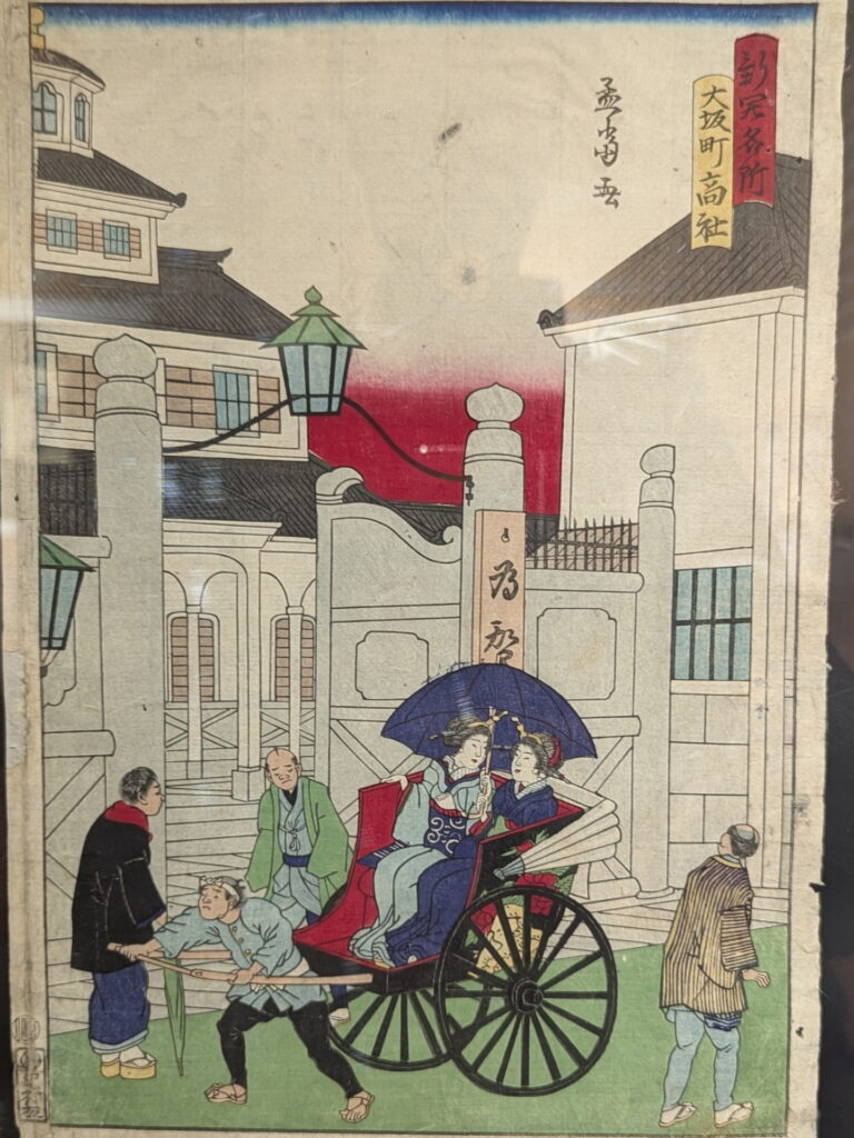 人力車に乗った着物姿の女性や、それを引く男性の様子、背景には当時の西洋風の建物とガス灯のようなものが見え、近代化が進む時代を描いています。