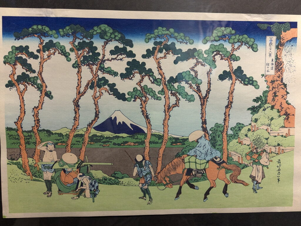 程ヶ谷宿(横浜市保土ケ谷区)近くの品野坂を行き交う旅人たちが松並木の間から富士山を望む風景を描いています。