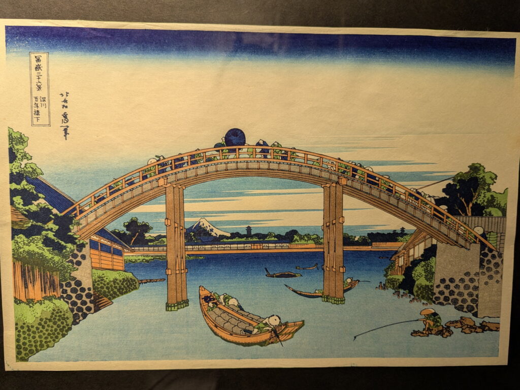 江戸の深川にあった万年橋の巨大なアーチの下から、隅田川を挟んで遠くに見える富士山を描いた作品です。