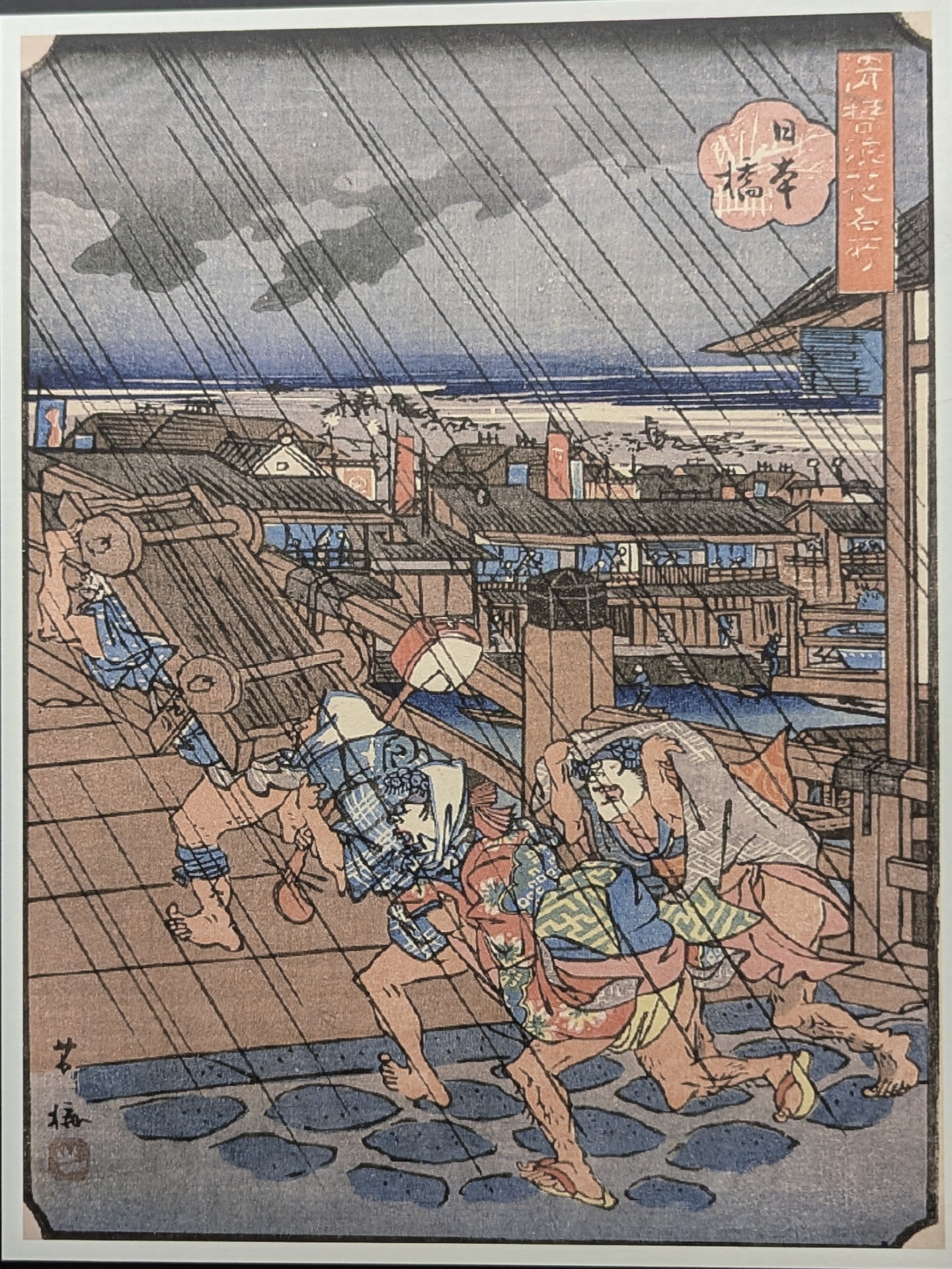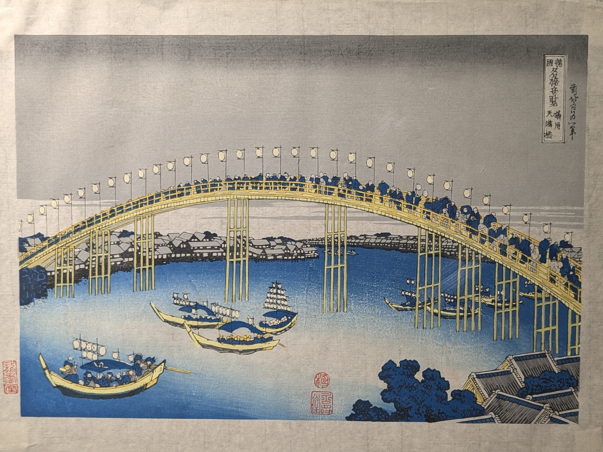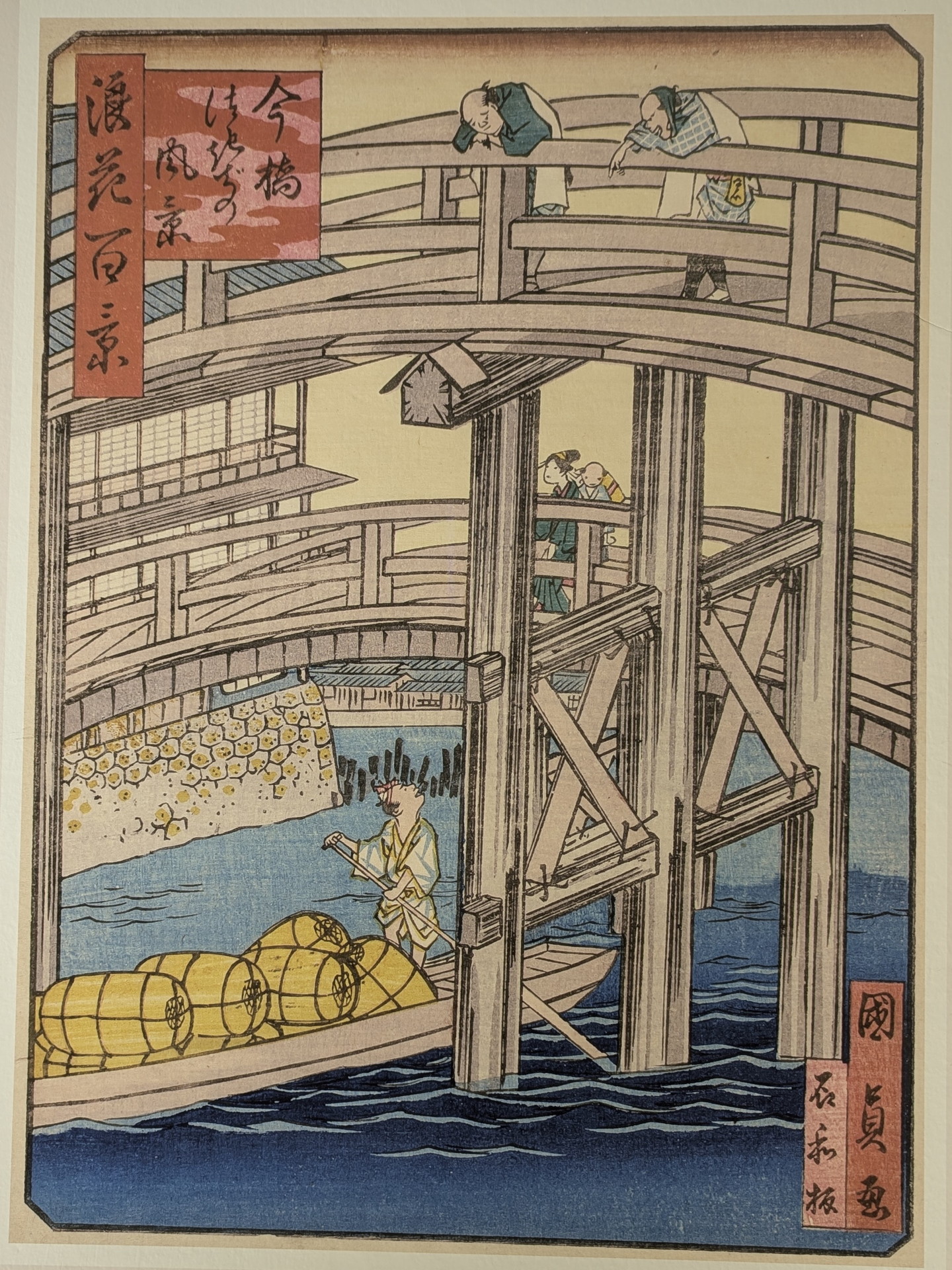 橋の上に人々が行き交う様子と、橋の下の船や釣り人という対比的な空間構成が特徴的です。