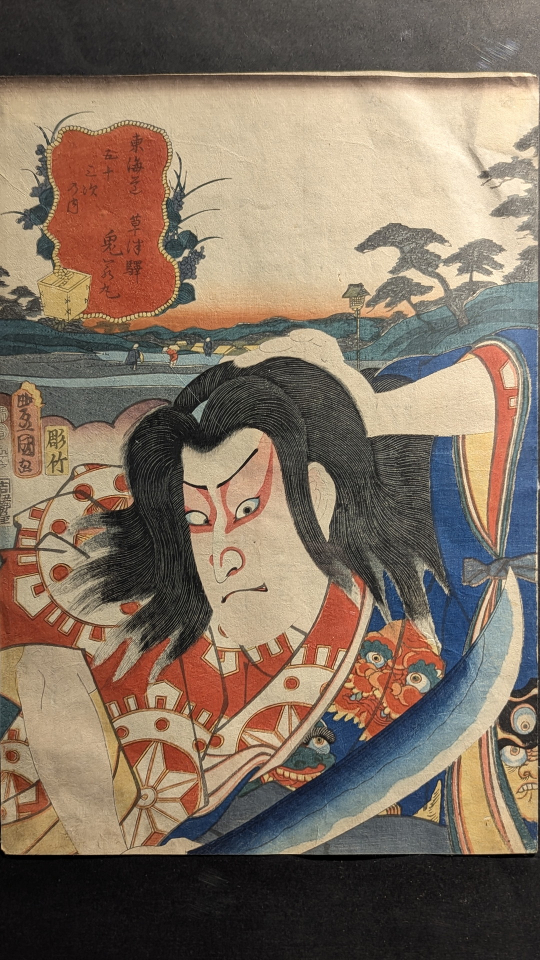 「役者見立東海道」と呼ばれるシリーズ作品の一つで、手前に役者絵、背景に演目や登場人物に関係する宿場の風景(この場合は草津駅)が配されていて、歌舞伎役者が「鬼若丸」に扮している様子が描かれています。