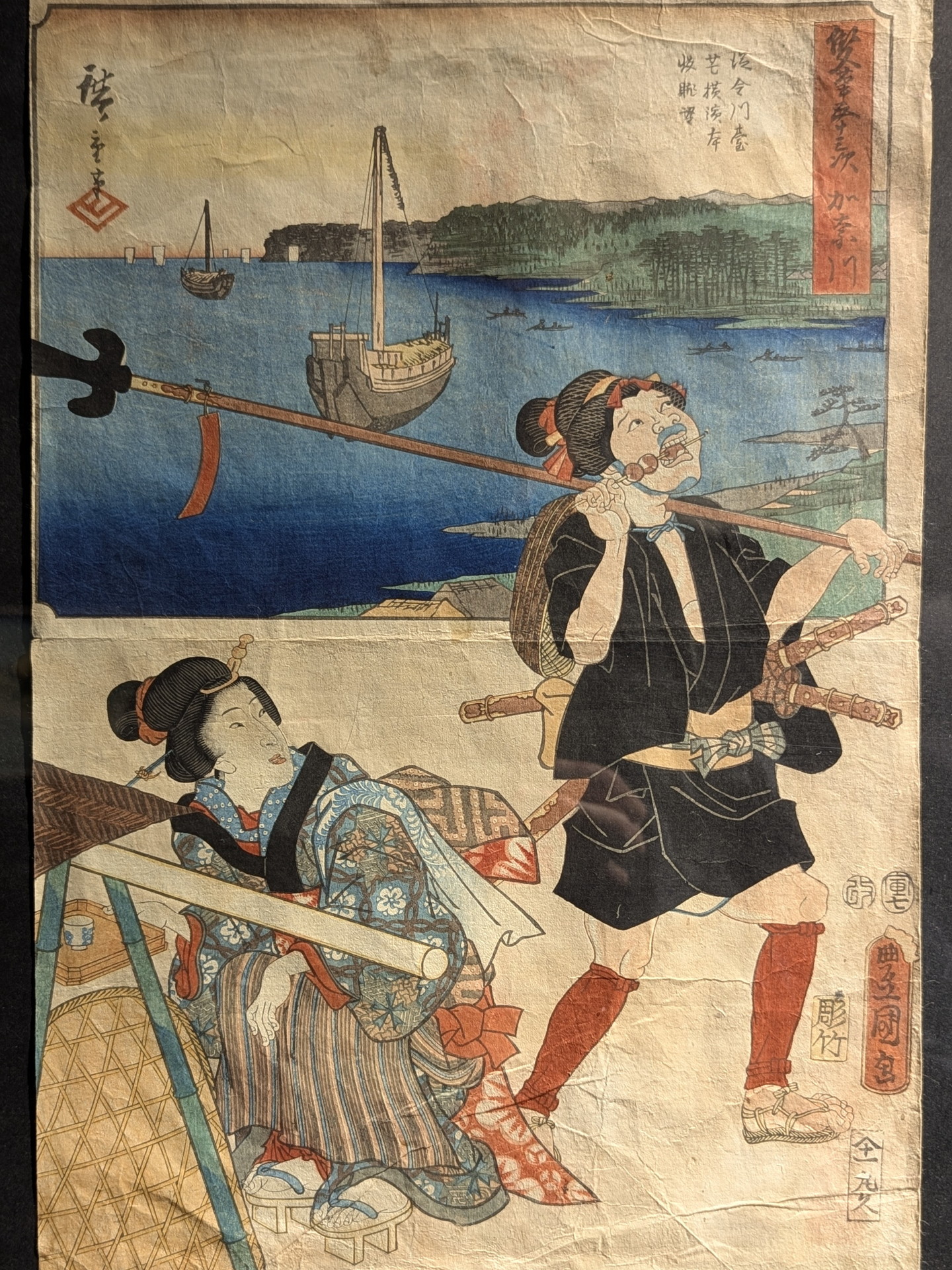 東海道五十三次の第3番目の宿場である「加奈川」(現在の神奈川県横浜市神奈川区)の男女が描かれています。