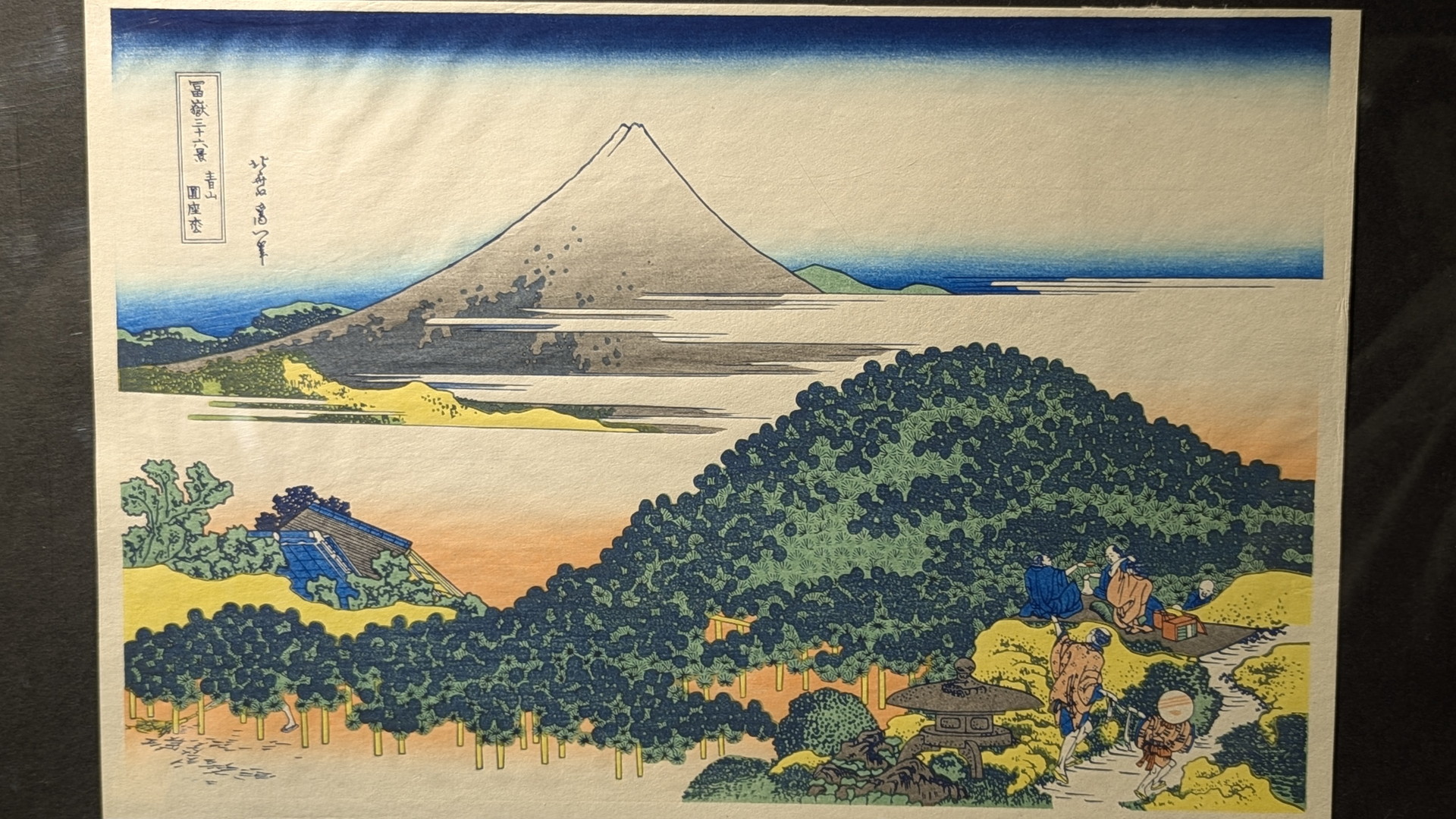 江戸時代の名所であった青山龍巌寺の庭にある、笠のような形をした大きな松の木(円座松)越しに、富士山を眺めた構図です。