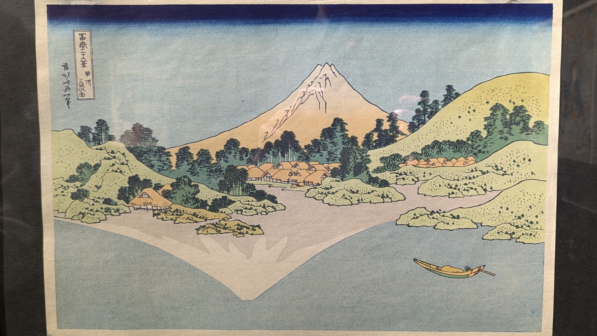 描かれている富士山自体には雪がなく初夏の様子ですが、湖面に映る富士には雪が描かれるという、北斎らしい独自の表現が見られます。