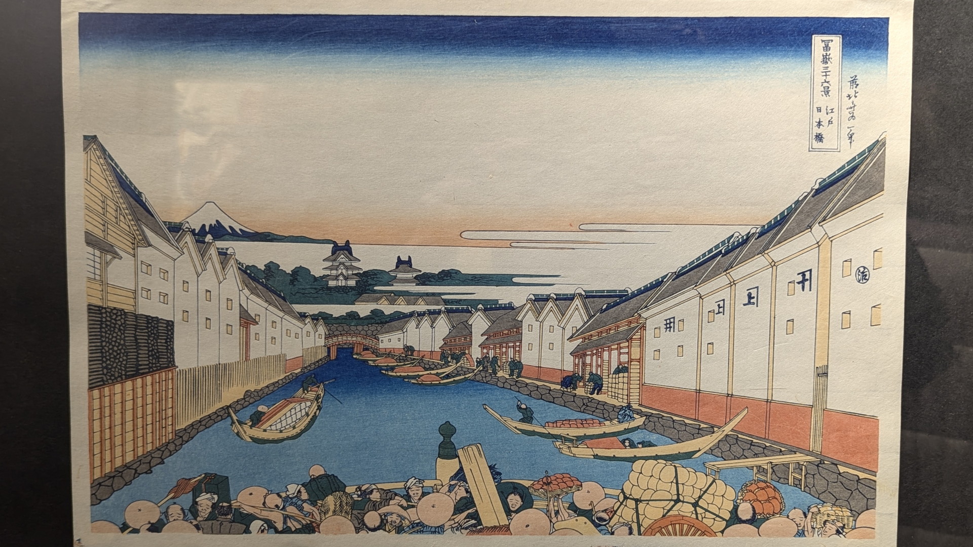 江戸の中心であった日本橋を舞台に、当時の賑わいと、霞の向こうには江戸城と富士山が見えています。