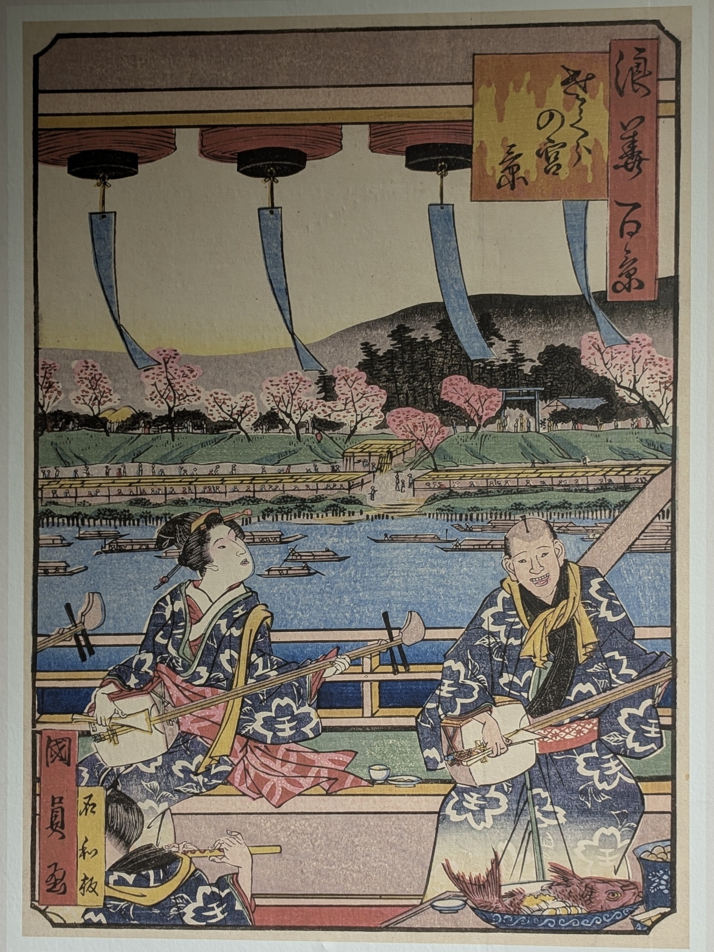 さくらの宮(現在の大阪市都島区桜之宮付近)の風景で、桜の季節に大川のほとりで三味線を弾いて楽しむ人々の様子が描かれています。