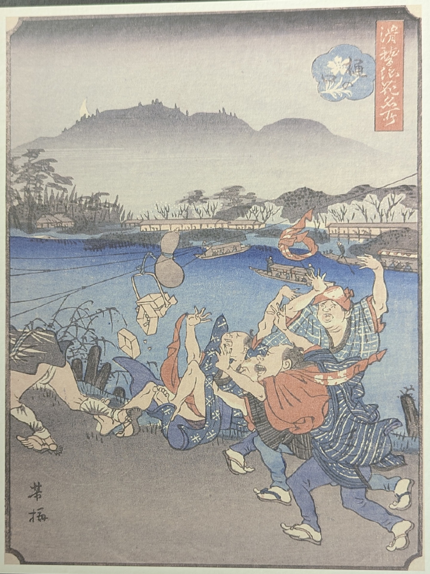 淀川沿いの風景を背景にして、ドタバタしている町人をユーモラスに描いています。
