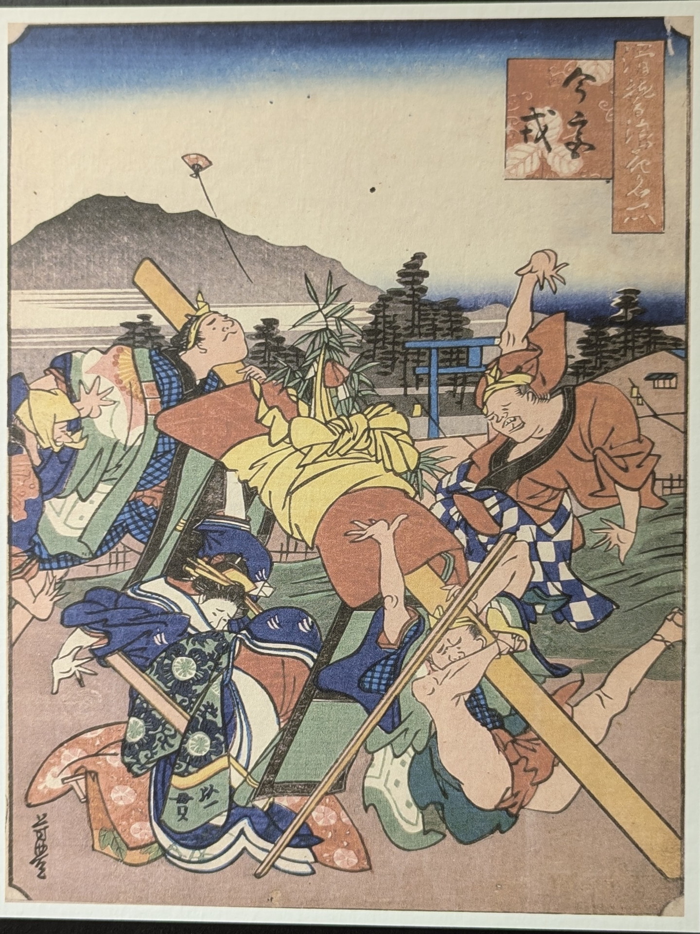 強風にあおられて傘が飛び交う騒然とした場面で、奥は高野山真言宗の寺院「大乗坊(だいじょうぼう)」でここに祀られている毘沙門天は商売繁盛や勝負の神様として親しまれていました。