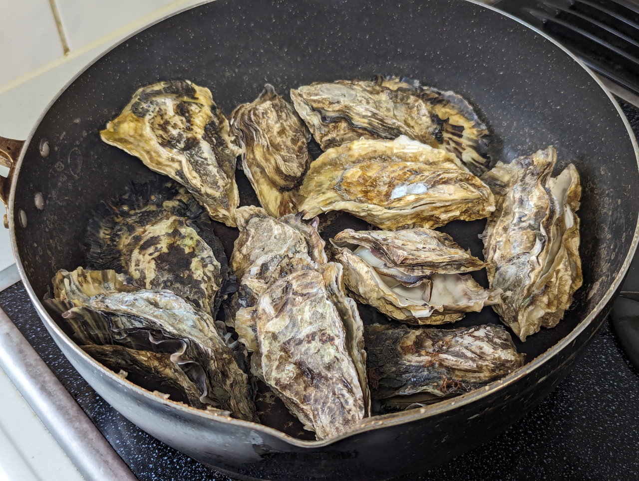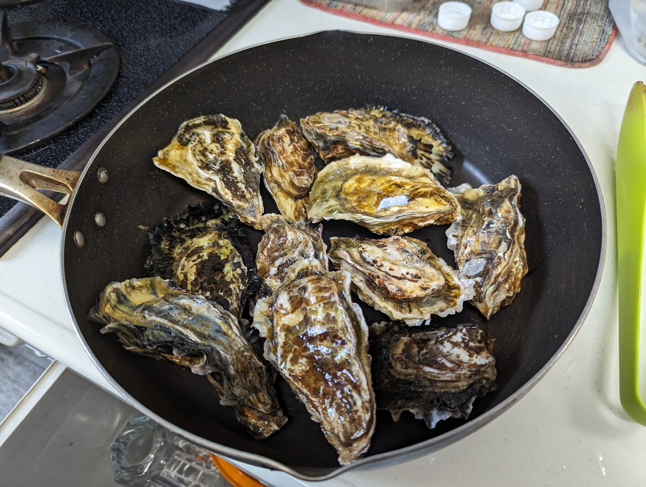生ものを平らげたので、続いては牡蠣をフライパンで蒸し牡蠣にします。