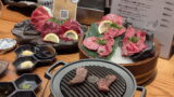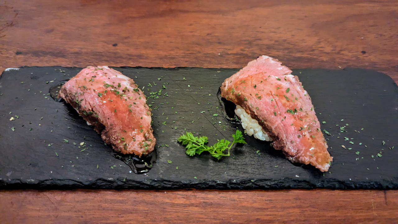 内容は前菜5種盛/カルパッチョ/アヒージョ/イベリコ豚ローストポークステーキ/牛たん寿司/デザートと全6皿です。