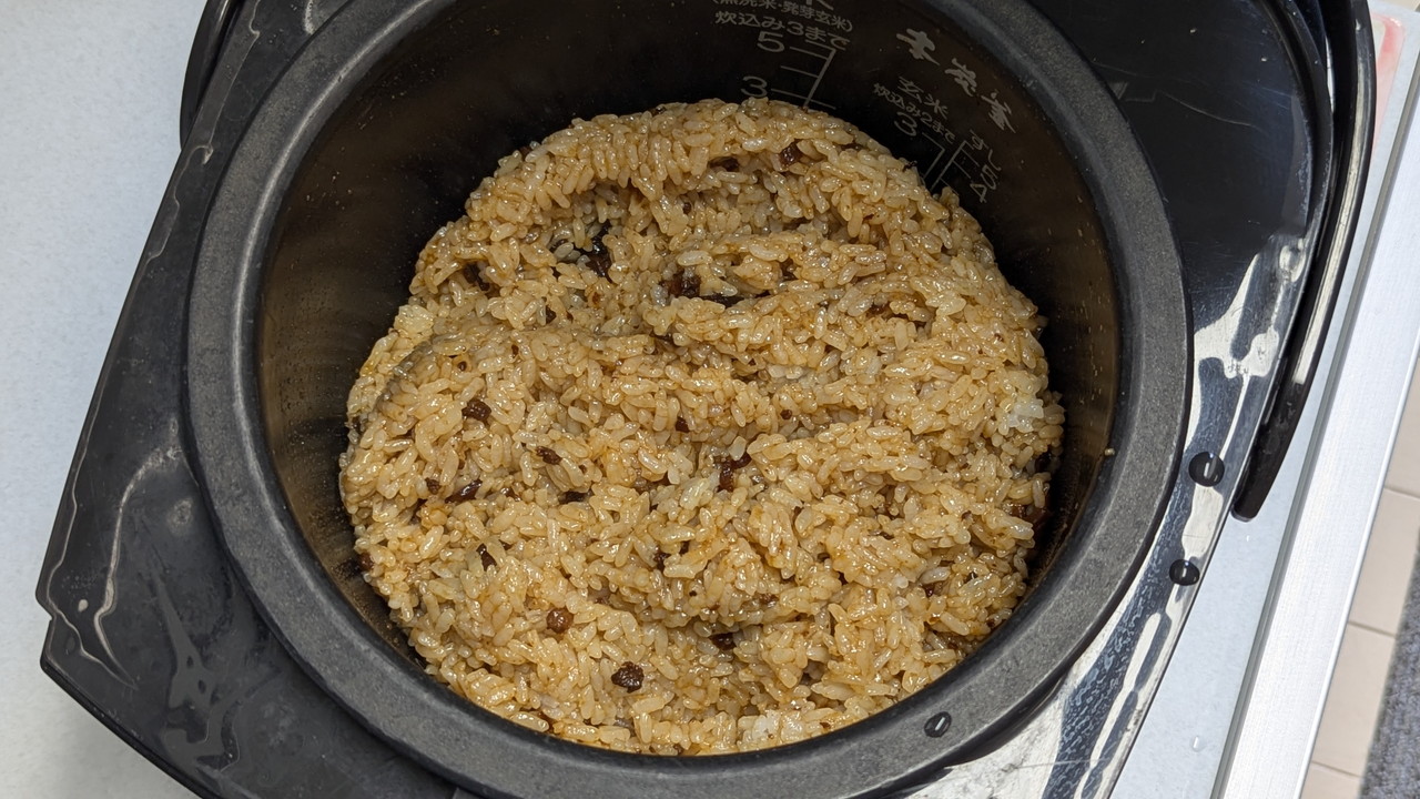 真っ白だったご飯が茶色になって「おこわ」っぽくなってますね。