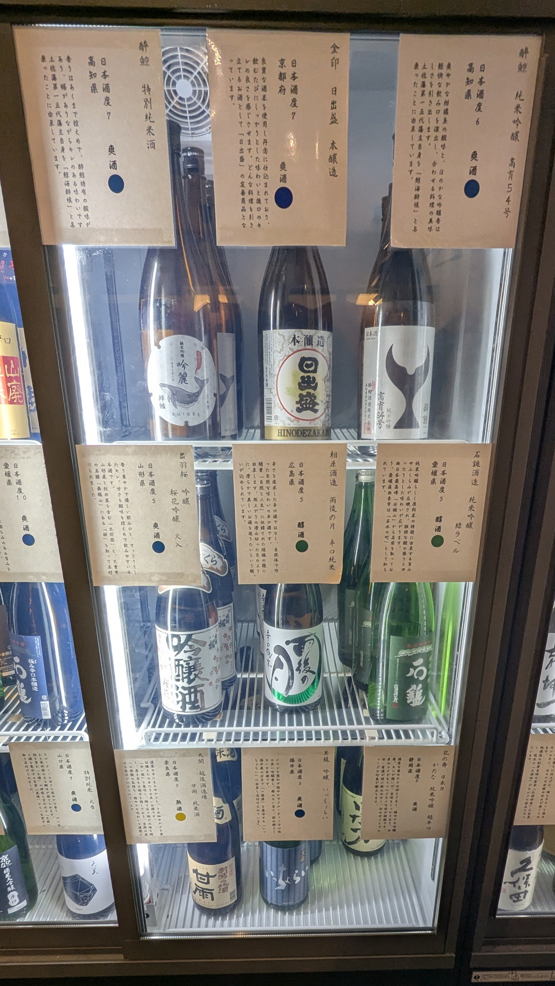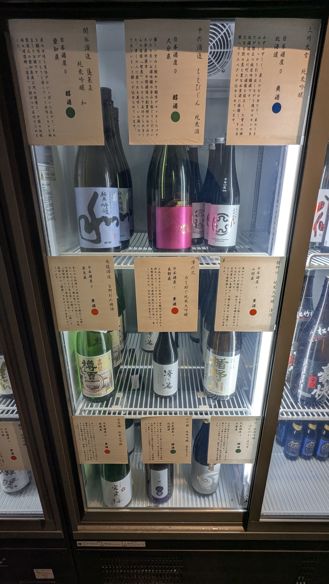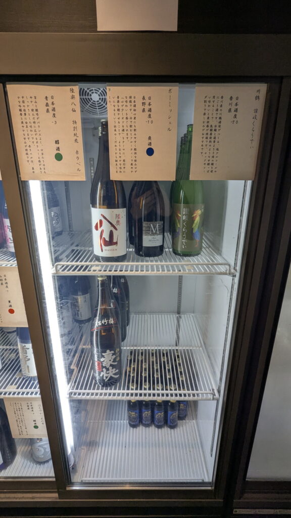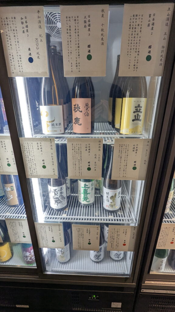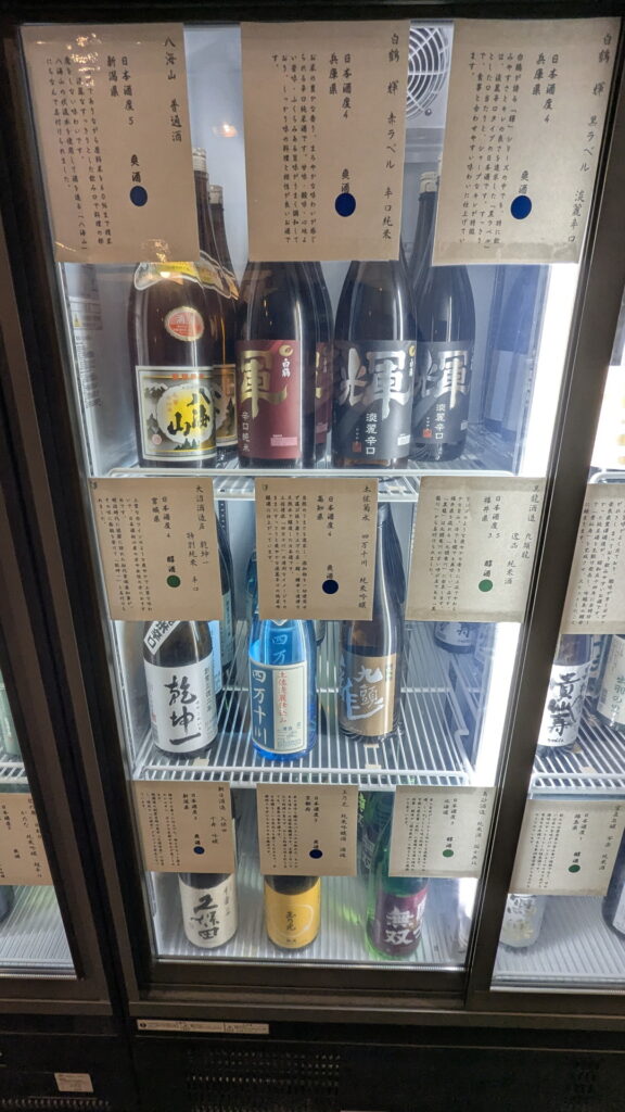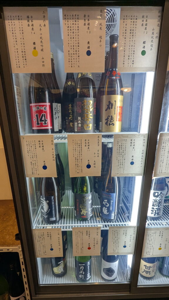 こちらが冷蔵庫の中身です。甘口から辛口・濃口から淡麗まで48種類のお酒が冷えていました。