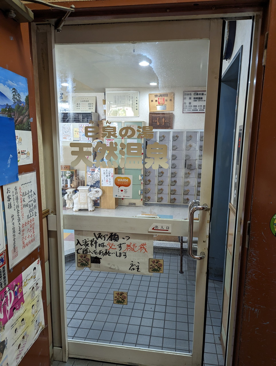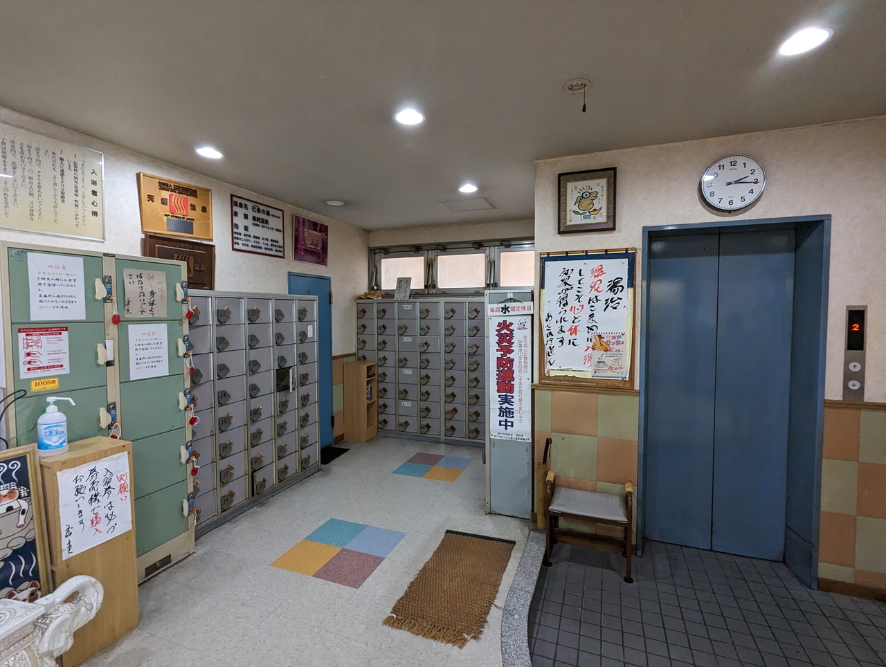 朝日温泉 靴箱とエレベータ