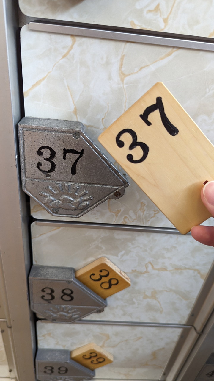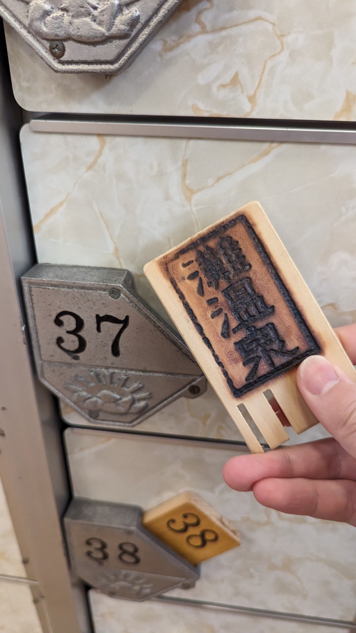 入浴料とげた箱の木札を渡すと、バスタオルと黄色い札を渡されるので、それを身に着けてサ室に入ります。