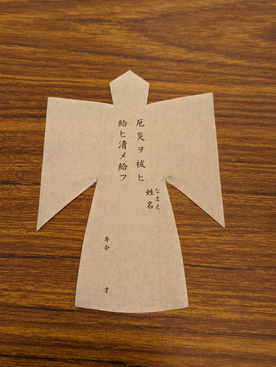 多井畑厄除八幡宮では、紙で「ひながた」を造って本人の代わりとして、これに災いを移して身代わりとして水に流すということをしています。