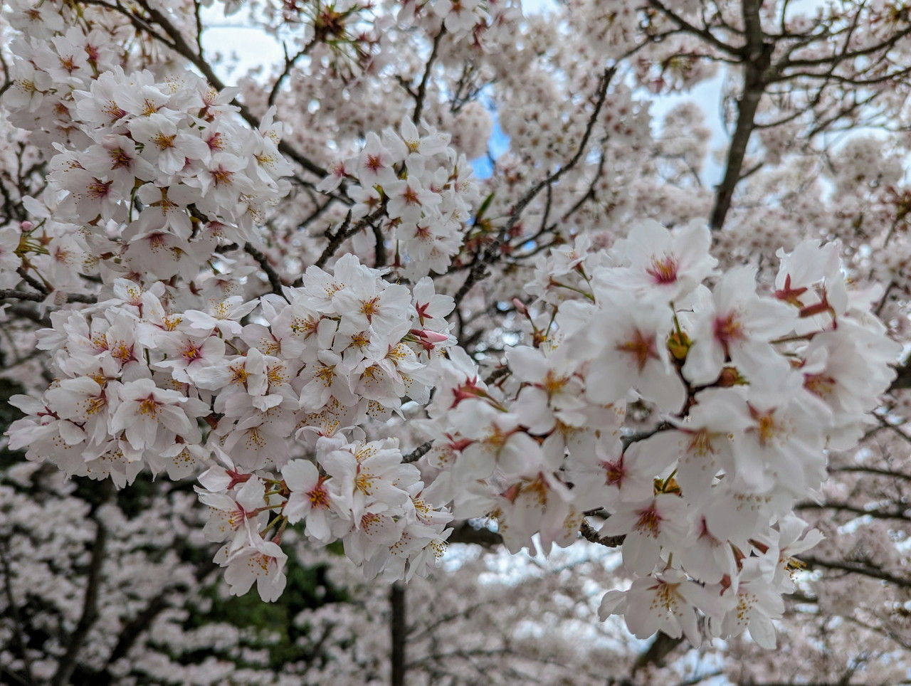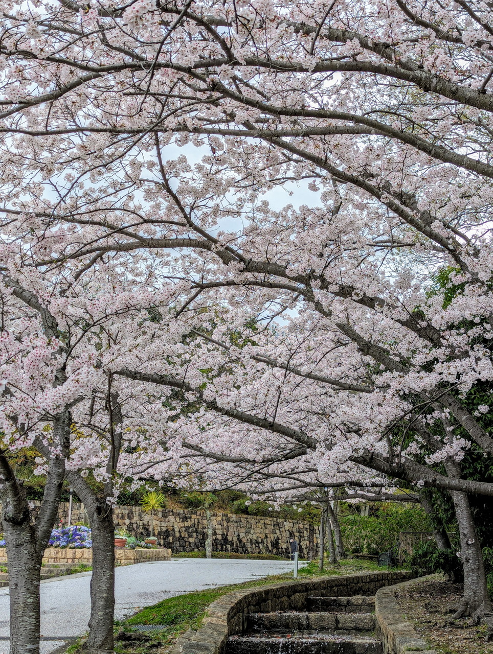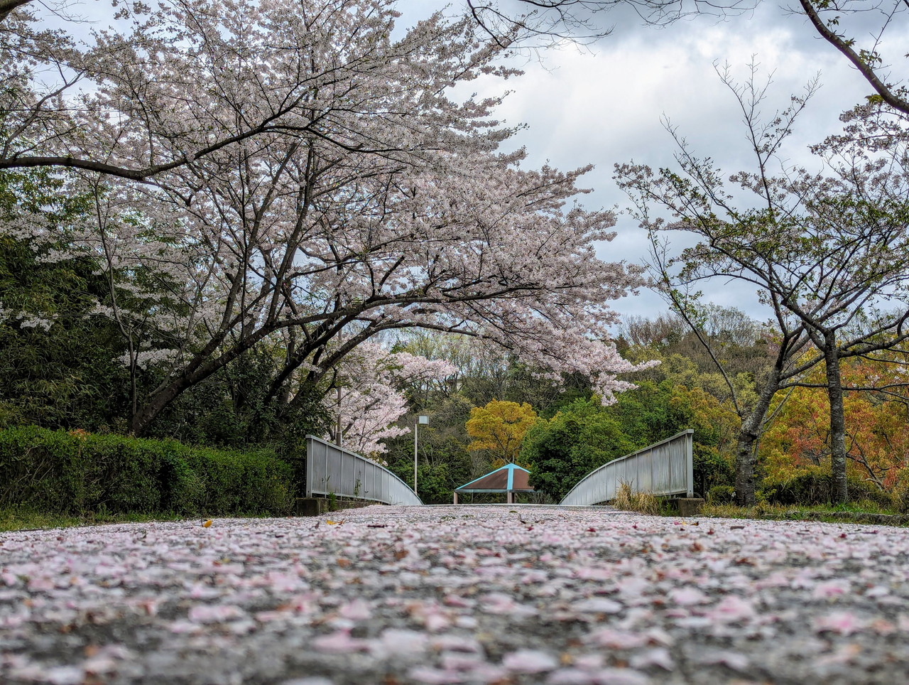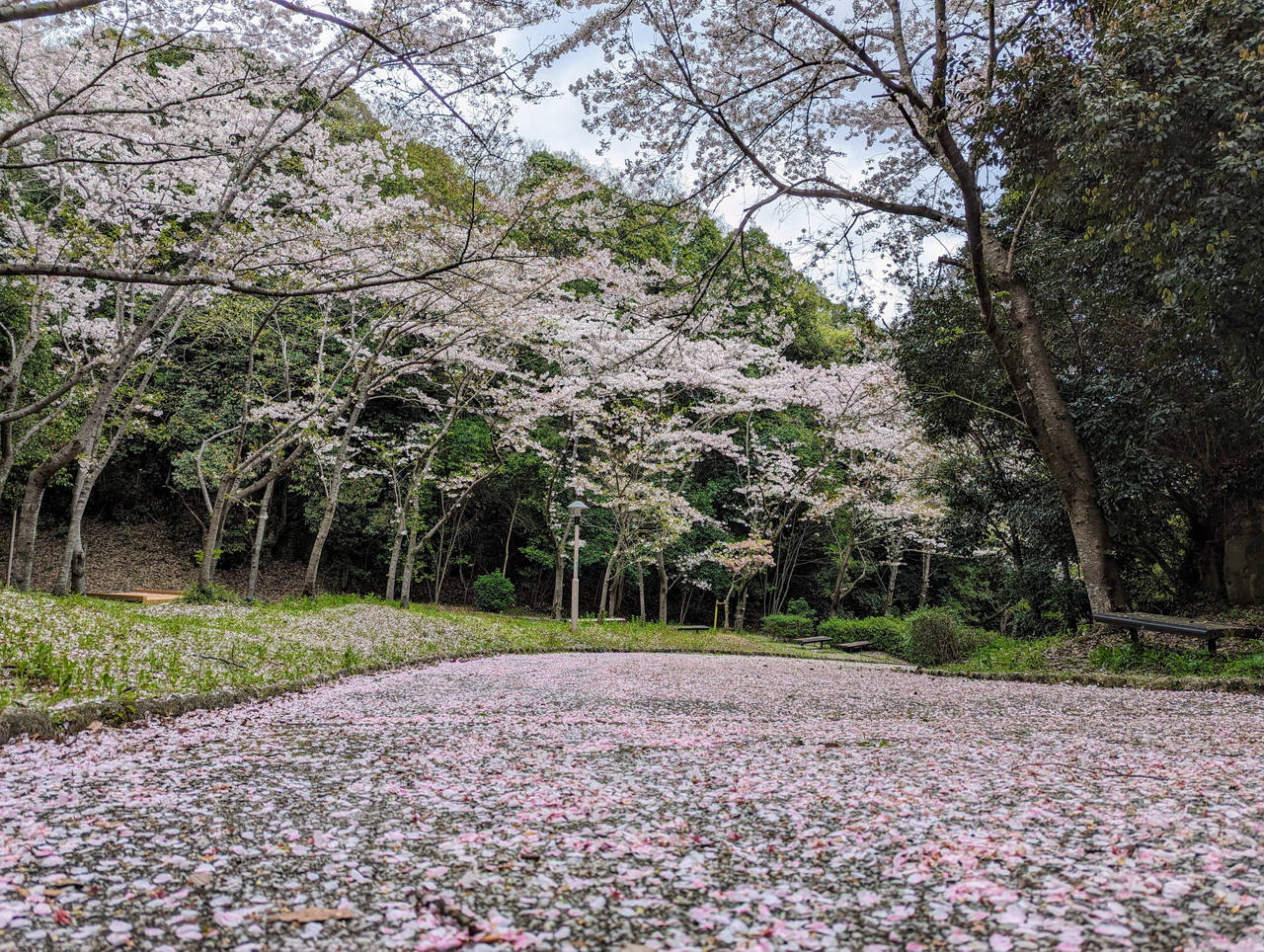 桜が結構散っていて、桜の花びらの絨毯ができていました。