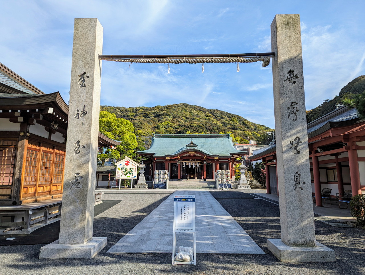 「注連柱(しめばしら)」をくぐって境内に入ります。