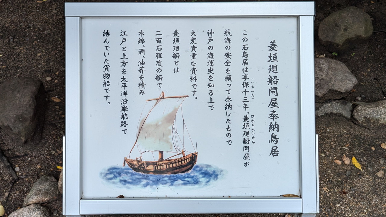ちなみにこの鳥居も先の三石神社と同様に阪神淡路大震災で倒壊して建て直されたものだそうで、倒壊前のものは御影石で関西一を誇っていたそうです。