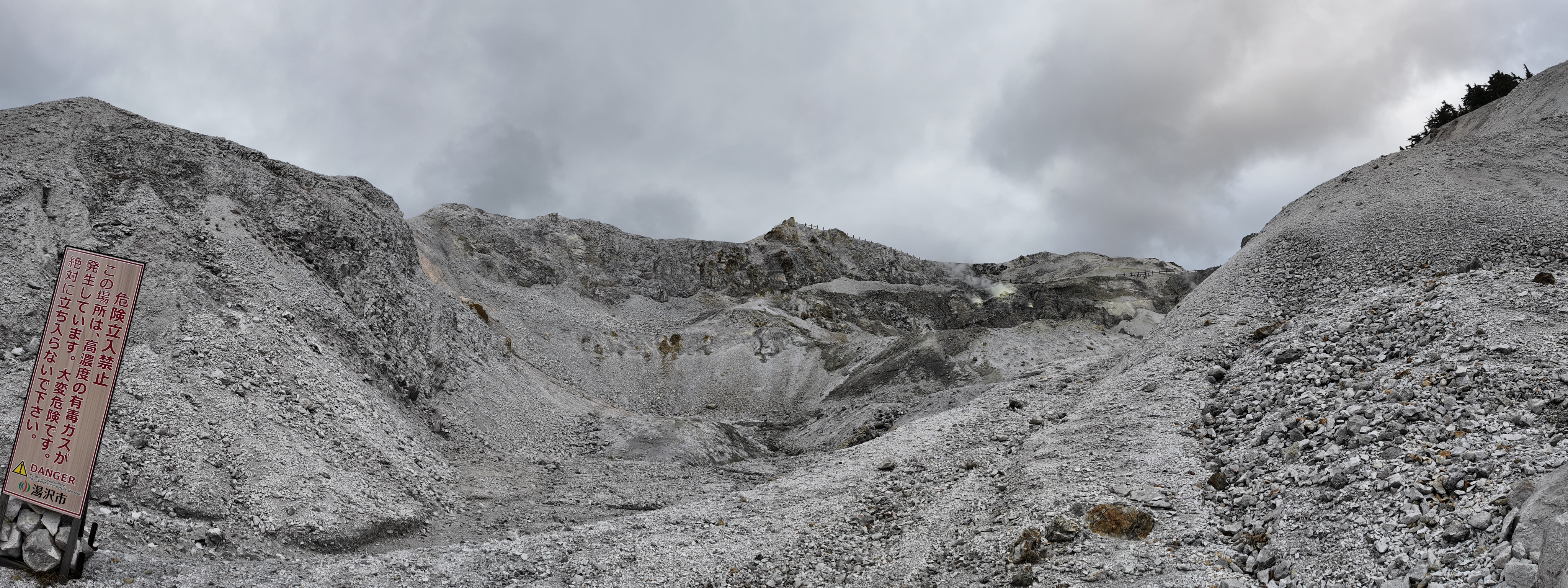 紅葉の赤や緑の木々が生えている山の中に、真っ白で荒涼とした眺めが広がっているのは独特の雰囲気があります。
