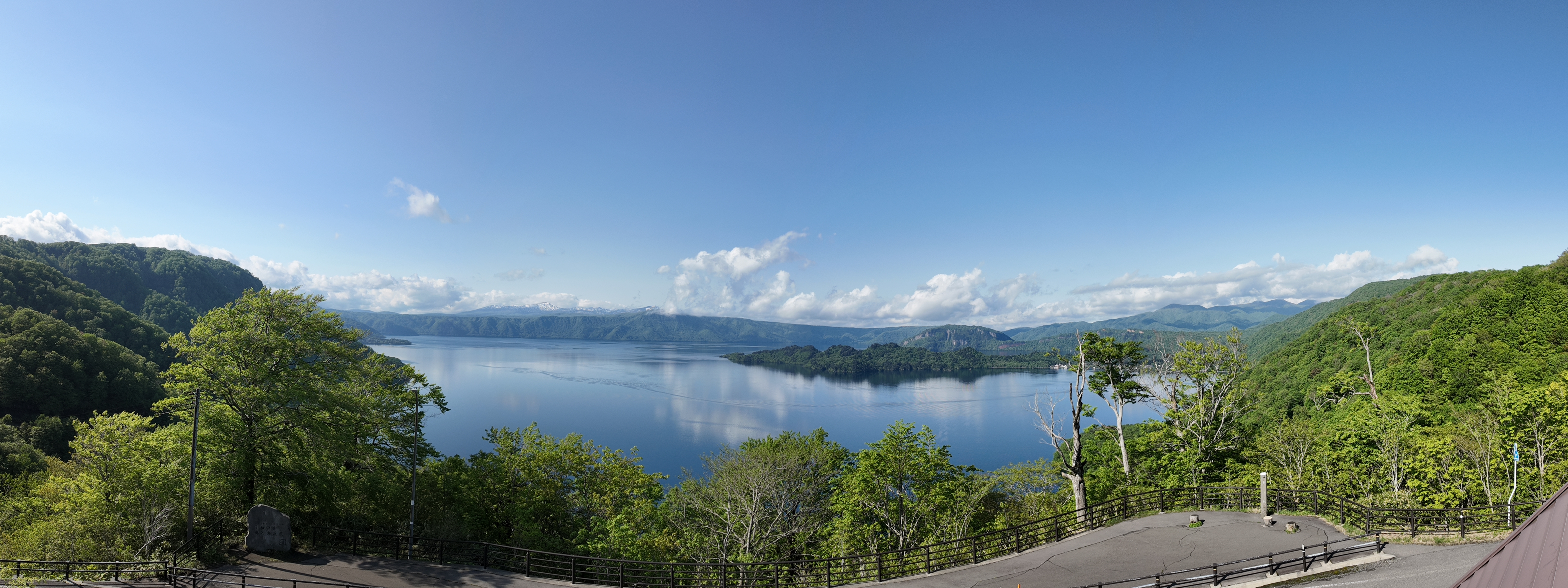 発荷峠第一展望休憩所は標高631mの高台にあって、眼下には「十和田湖ブルー」と呼ばれる深く美しい青色の湖面が広がり、その向こうには十和田湖に突き出す中山半島と御倉半島、そして遠くには十和田カルデラの外輪山である御鼻部山や、南八甲田の山々まで見渡すことができます。特に晴れた日には、湖面と空の青が一体となり、視界いっぱいに広がる壮大な景色は圧巻です。