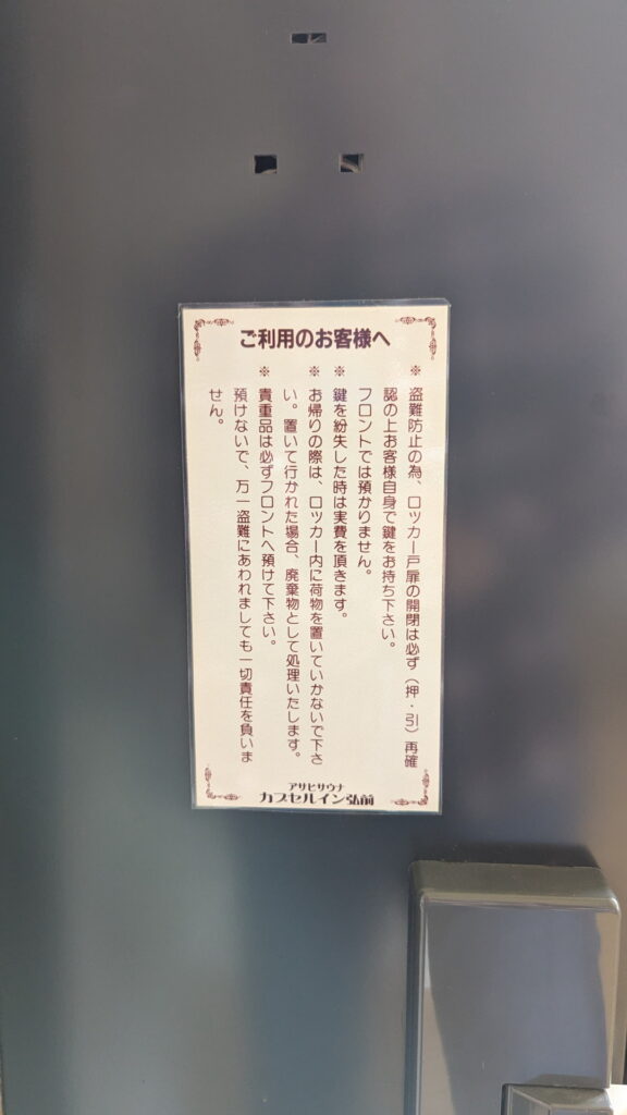 脱衣所に鍵付きロッカーがあるのですが、それを使用したい場合はフロント横に「靴」を預けます。