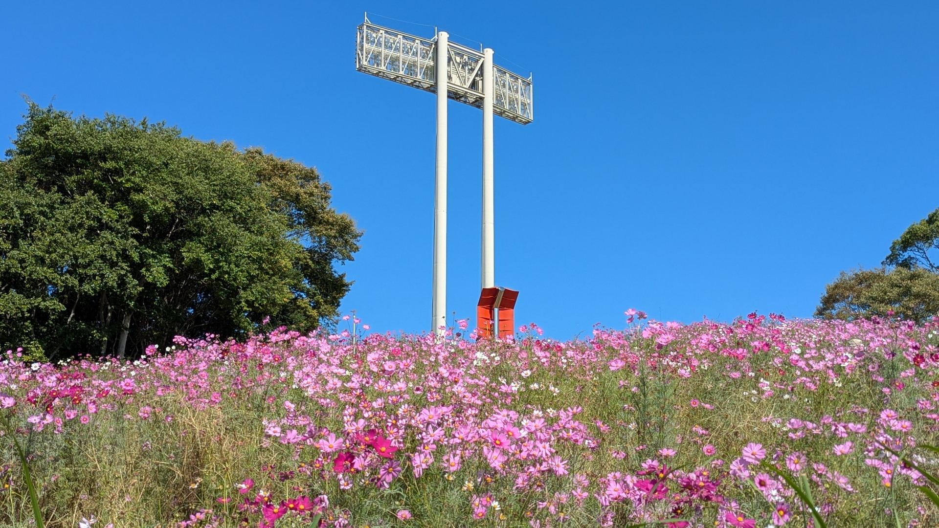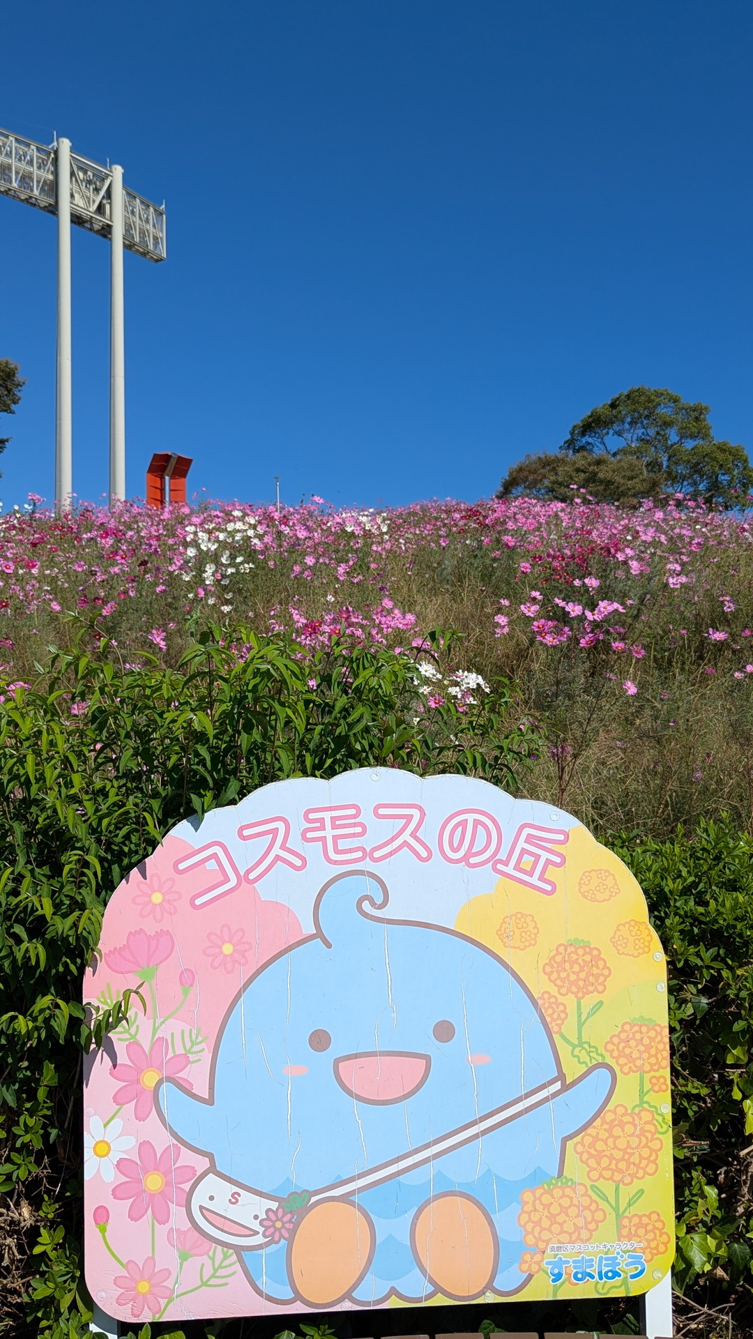 神戸市須磨区にある「神戸総合運動公園 コスモスの丘」は、秋になると一面に咲くコスモスで知られる人気の花スポットです。公園の北側エリア、ユニバー記念競技場の西側の斜面に広がる約1万㎡の花畑には、ピンク・白・赤など色とりどりのコスモスが咲き誇ります。