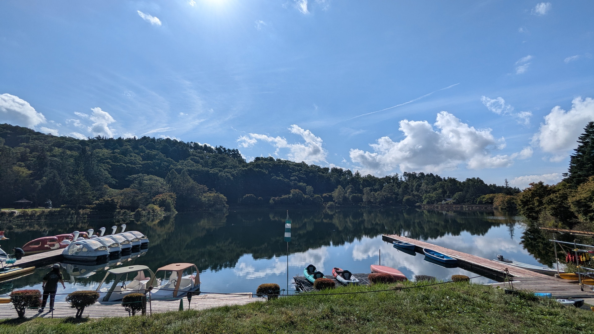 風が無くて湖面が穏やかだったので、青空や湖岸の林が写り込んで綺麗でした。