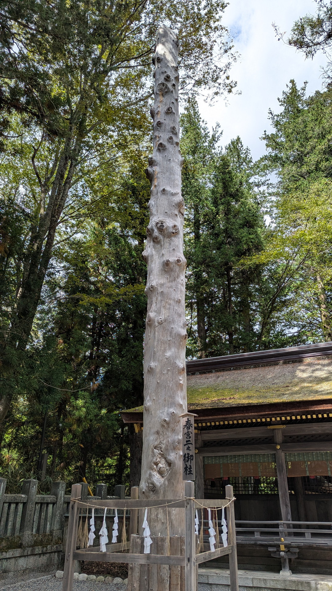 奥の「幣拝殿」の両脇に「御柱」が立てられています。