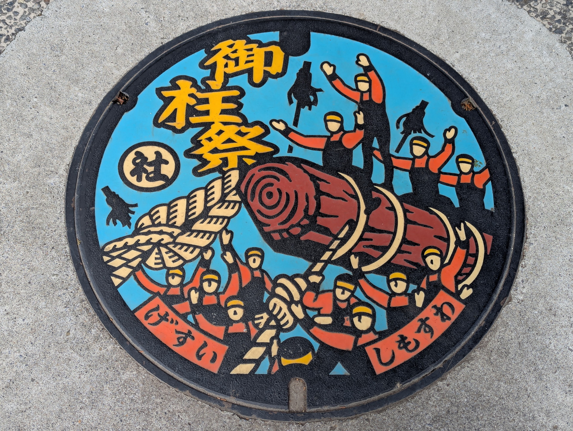 駐車場に戻る途中、派手なマンホール蓋があるのを見つけて近づいてみると、「御柱祭」のデザインでした。