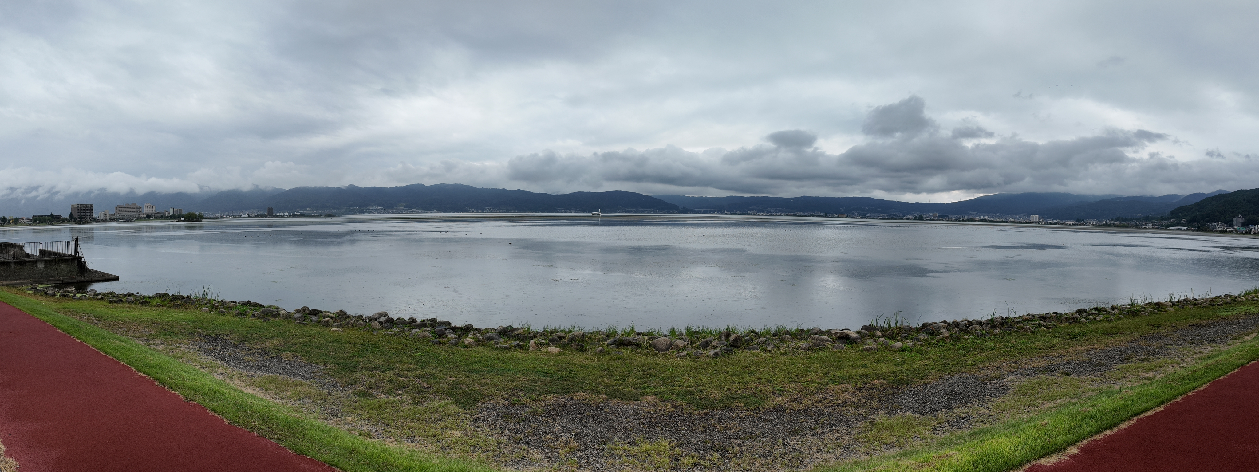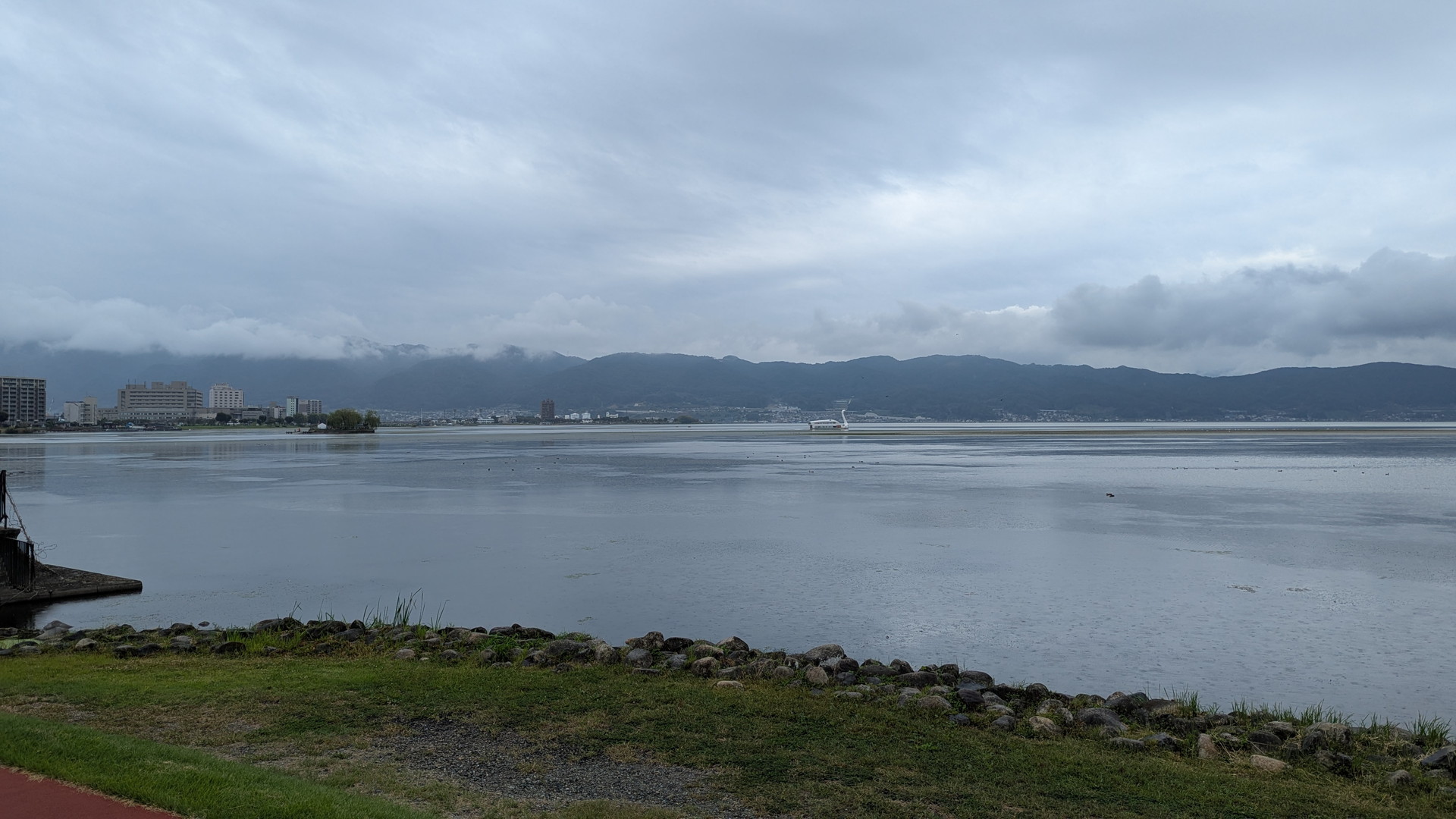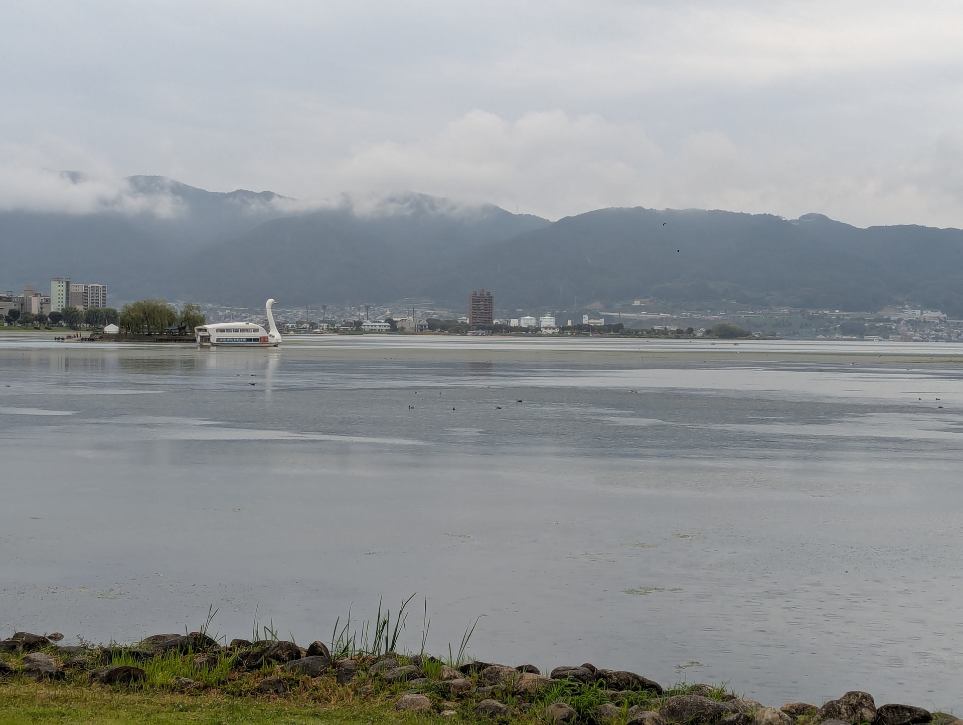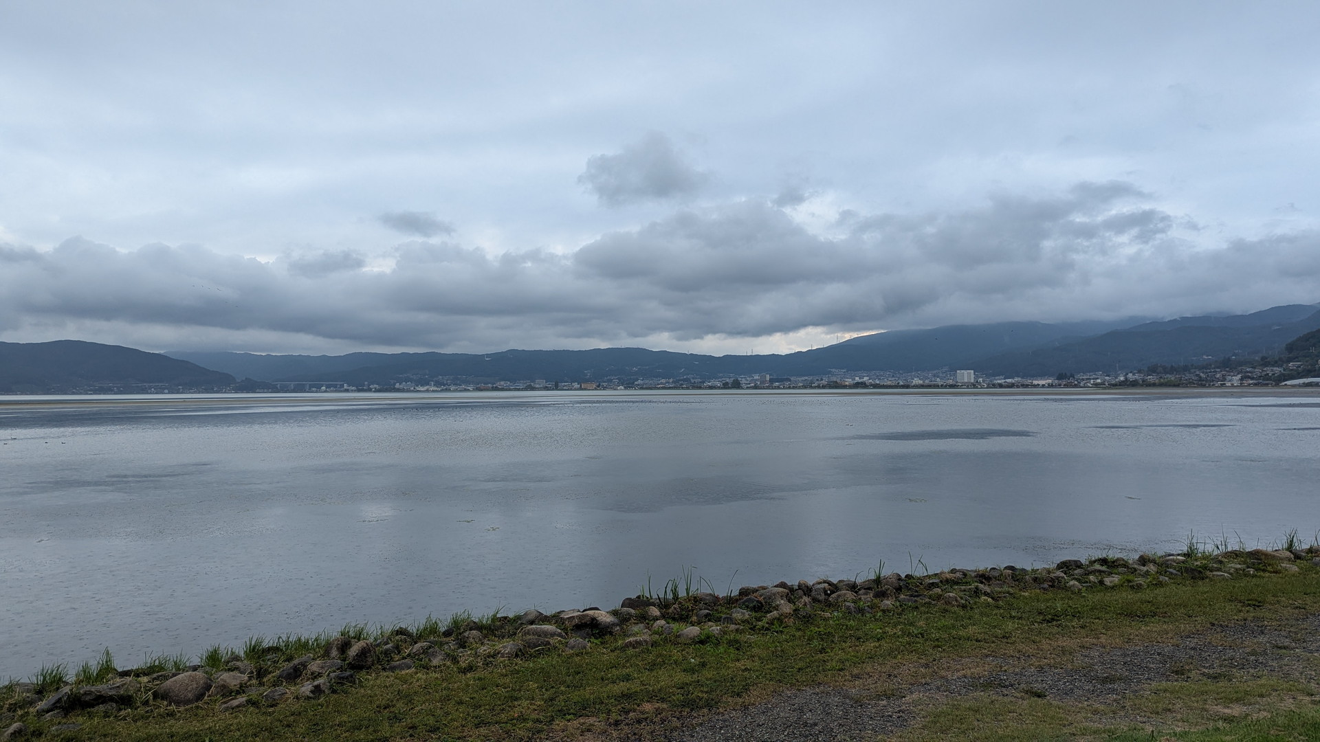 足湯を出て、目の前に広がる諏訪湖の湖岸にきました。
