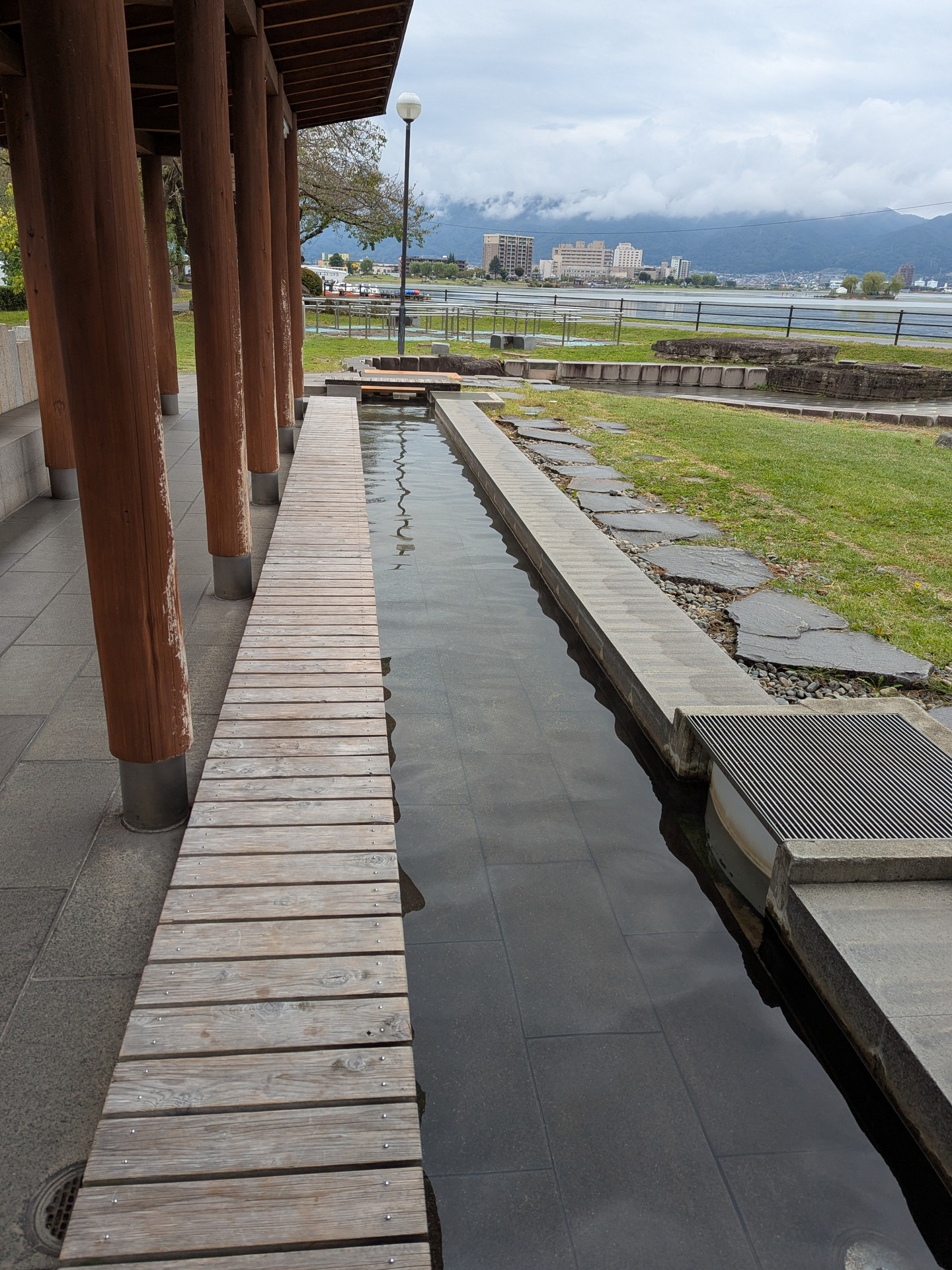 本日の観光1か所目は、諏訪湖畔にある「諏訪湖間欠泉センター」の予定でしたが、駐車場に車を停めたところ「湖畔公園足湯」が見えたので、まずは足湯に入ってみたいと思います。