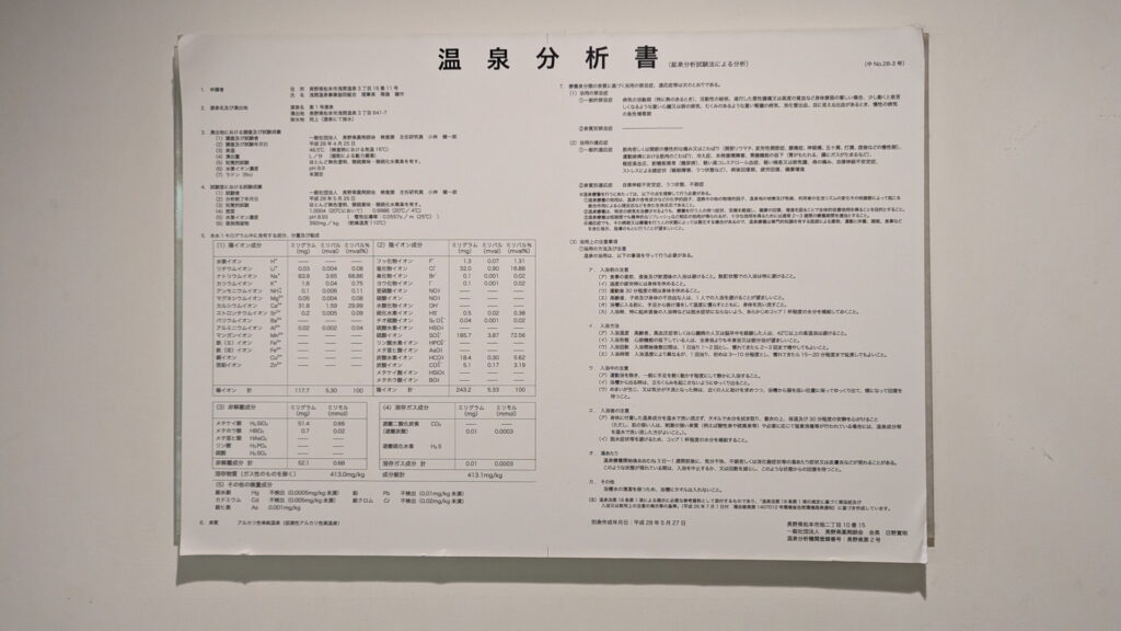 「湯々庵 枇杷の湯」の天然温泉の泉質はpH8.9の「アルカリ性単純温泉」で、メタケイ酸が51mg/kg含まれている美肌の湯になります。