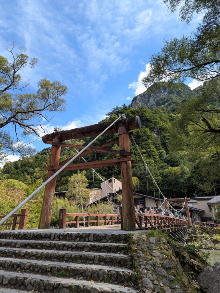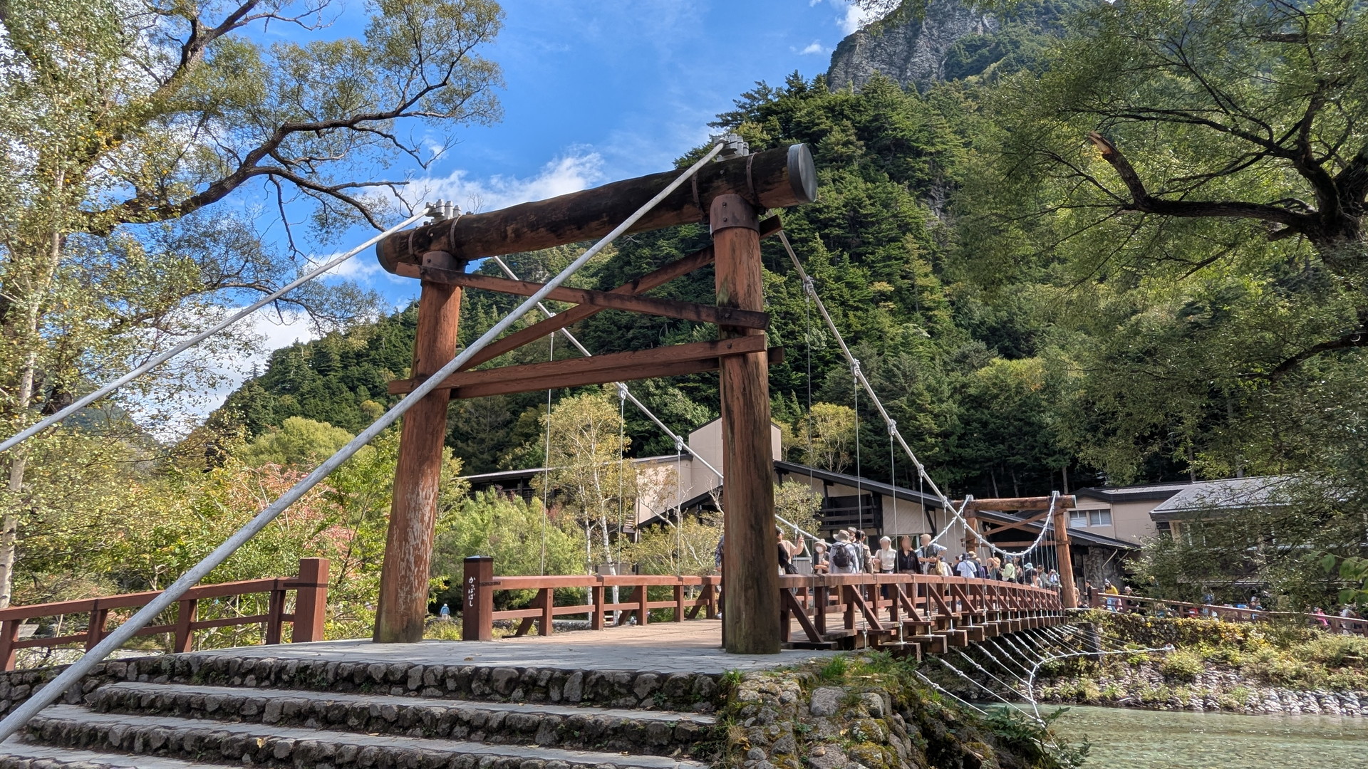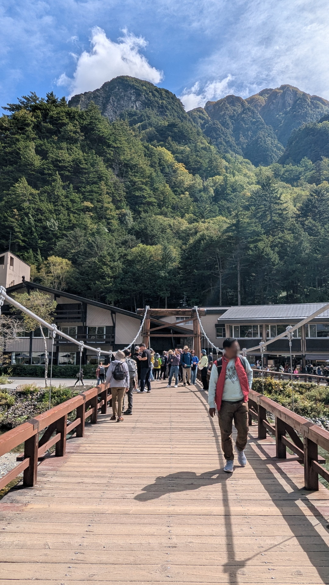 河童橋は上高地の中心に位置する象徴的な吊り橋で、上高地バスターミナルから徒歩約5分の好立地にあり、周辺にはホテル、レストラン、カフェ、土産物屋などが集まっているので、常に多くの人々で賑わっています。