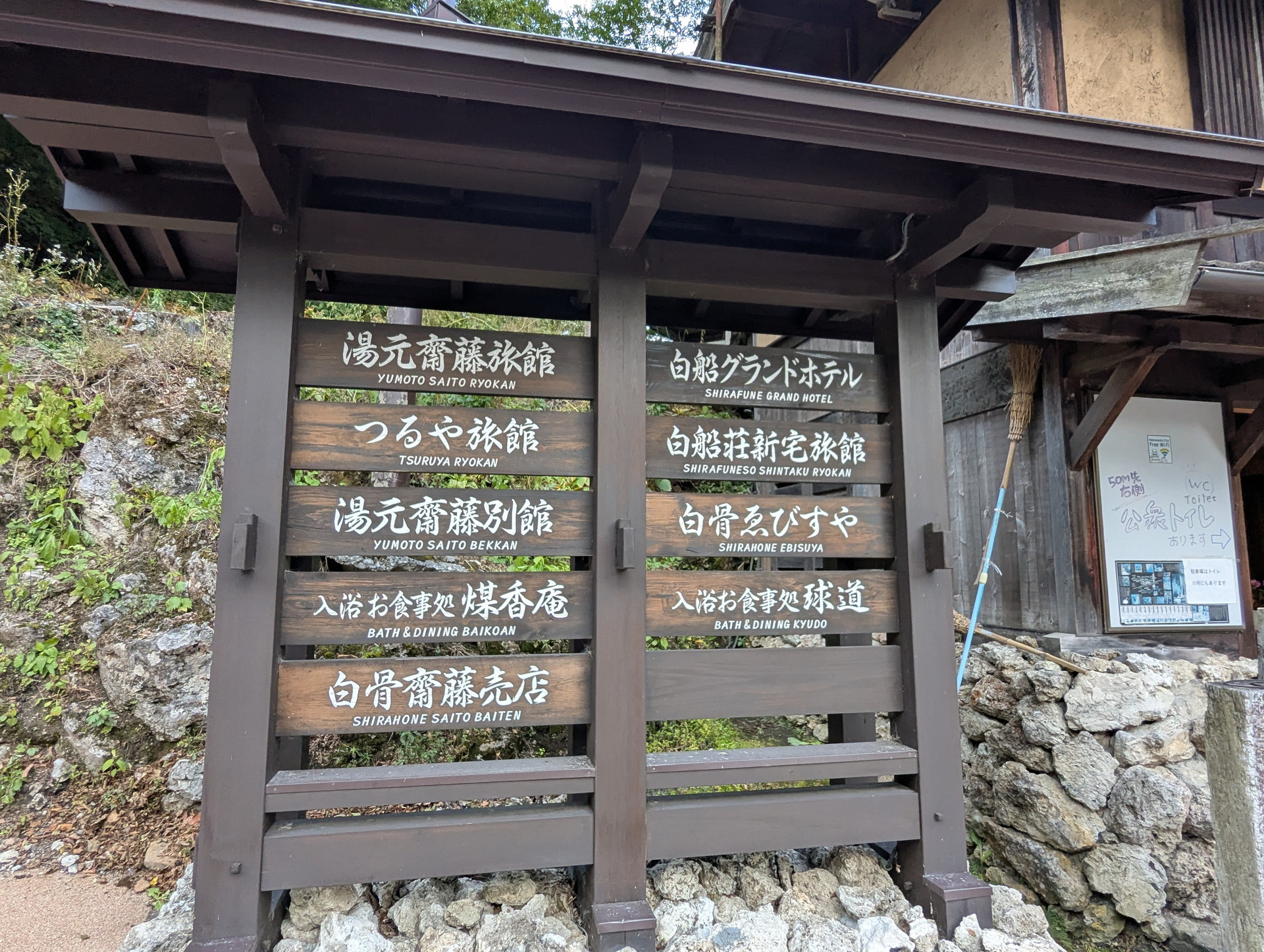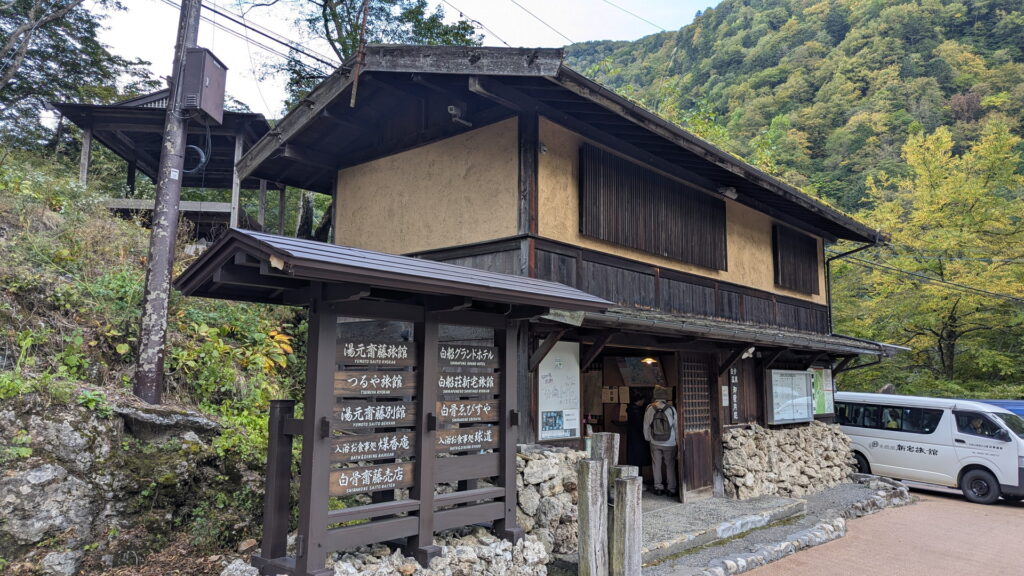 上高地散策を終えて、さわんどバスターミナルから車で10分ほどの場所にある「白骨温泉(しらほねおんせん)」に向かいます。