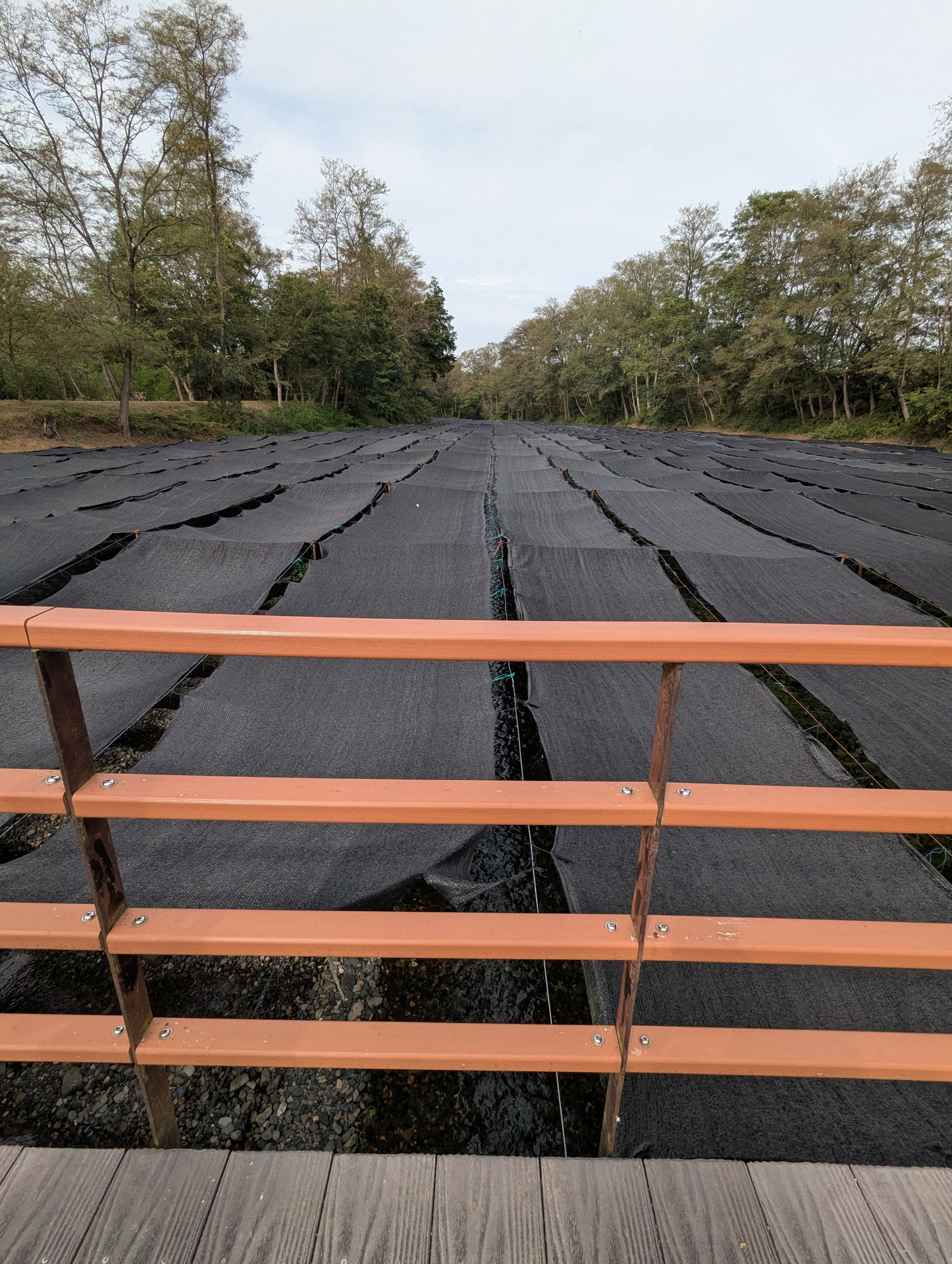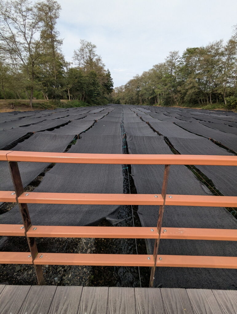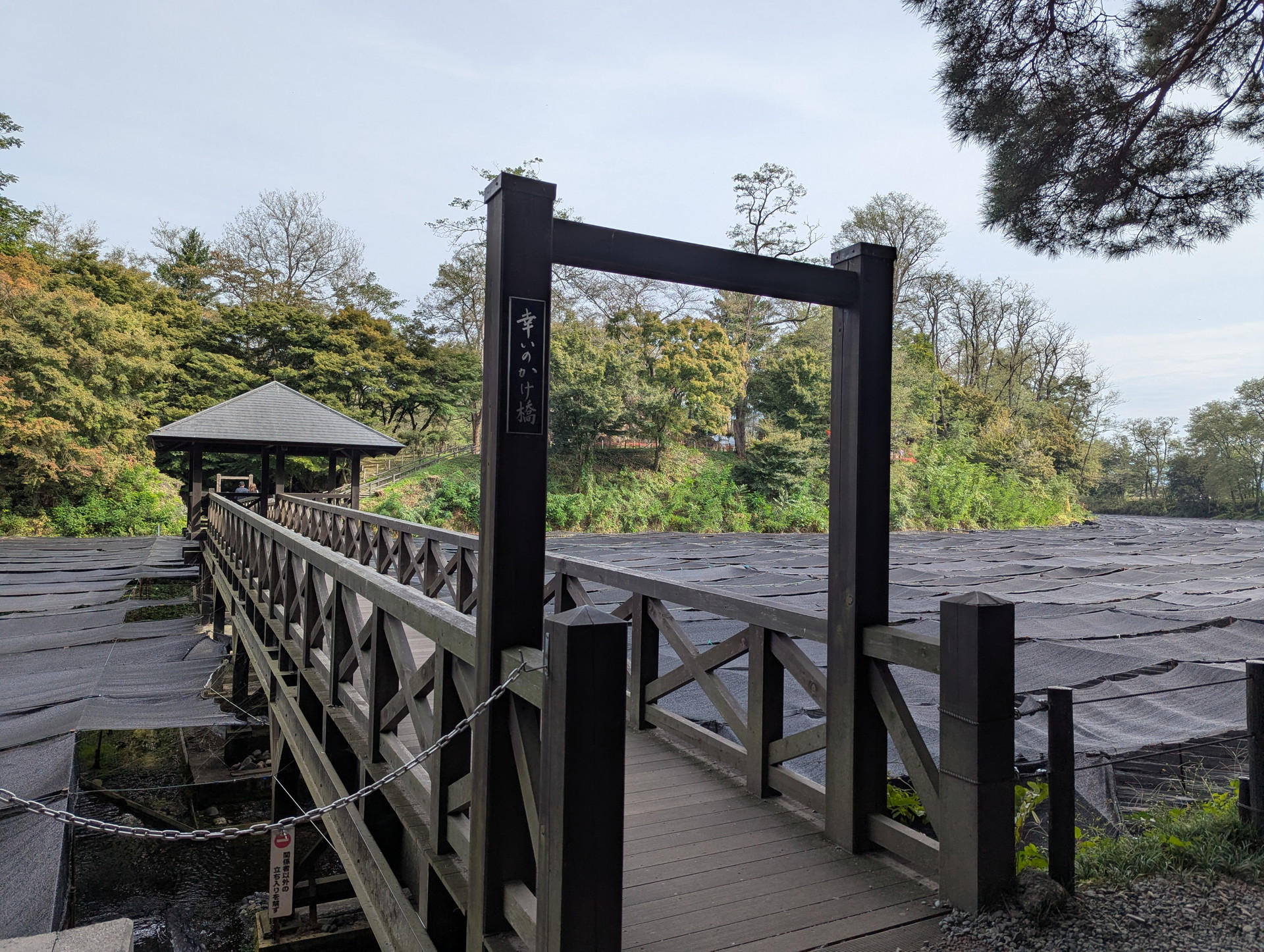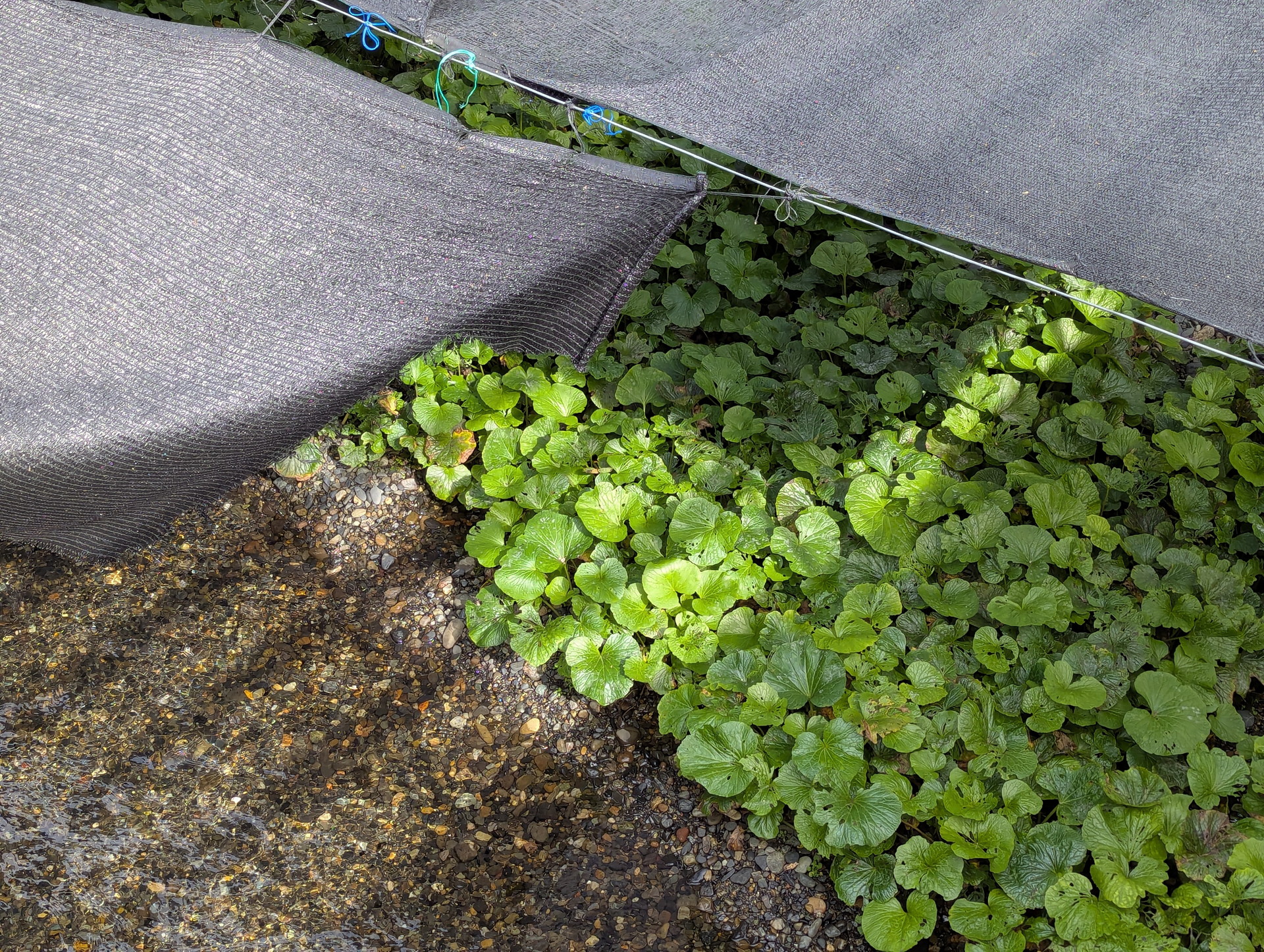 橋を渡ったところに階段があって、そこを下りると日よけの下でわさびが栽培されている様子を見ることができました。