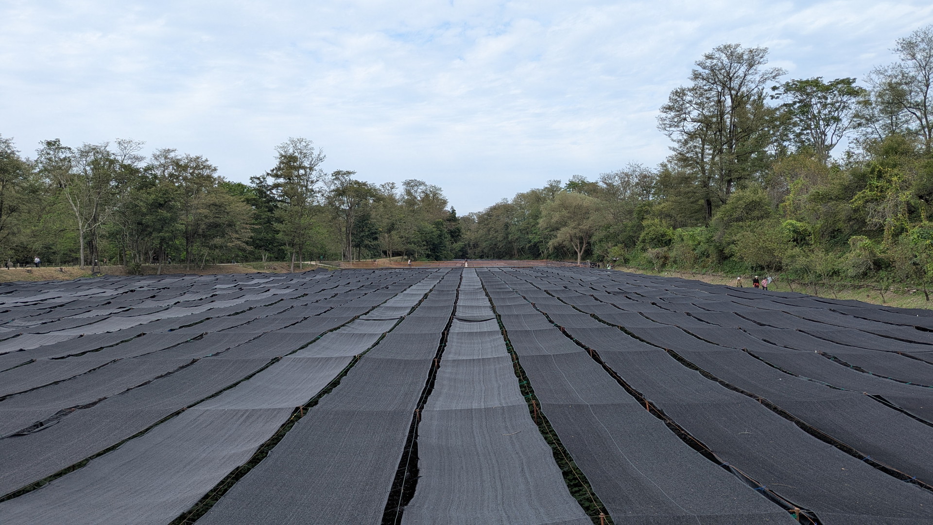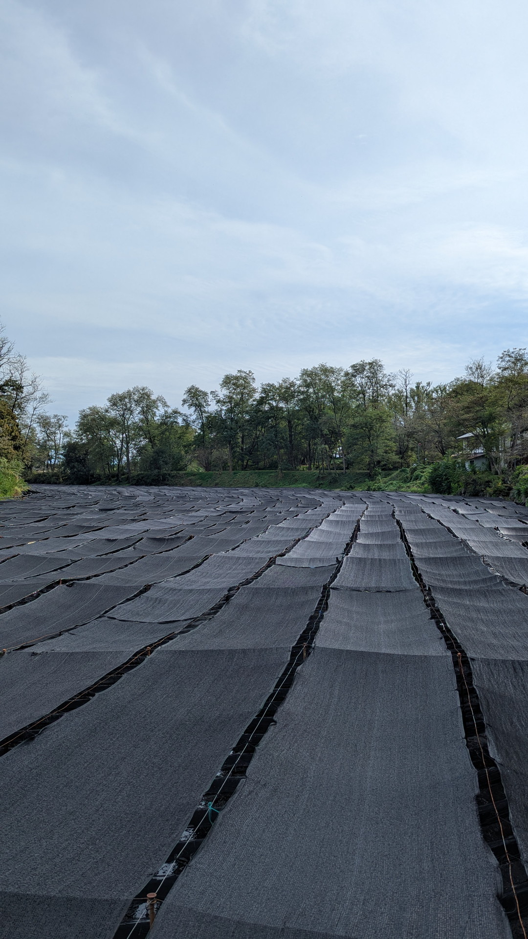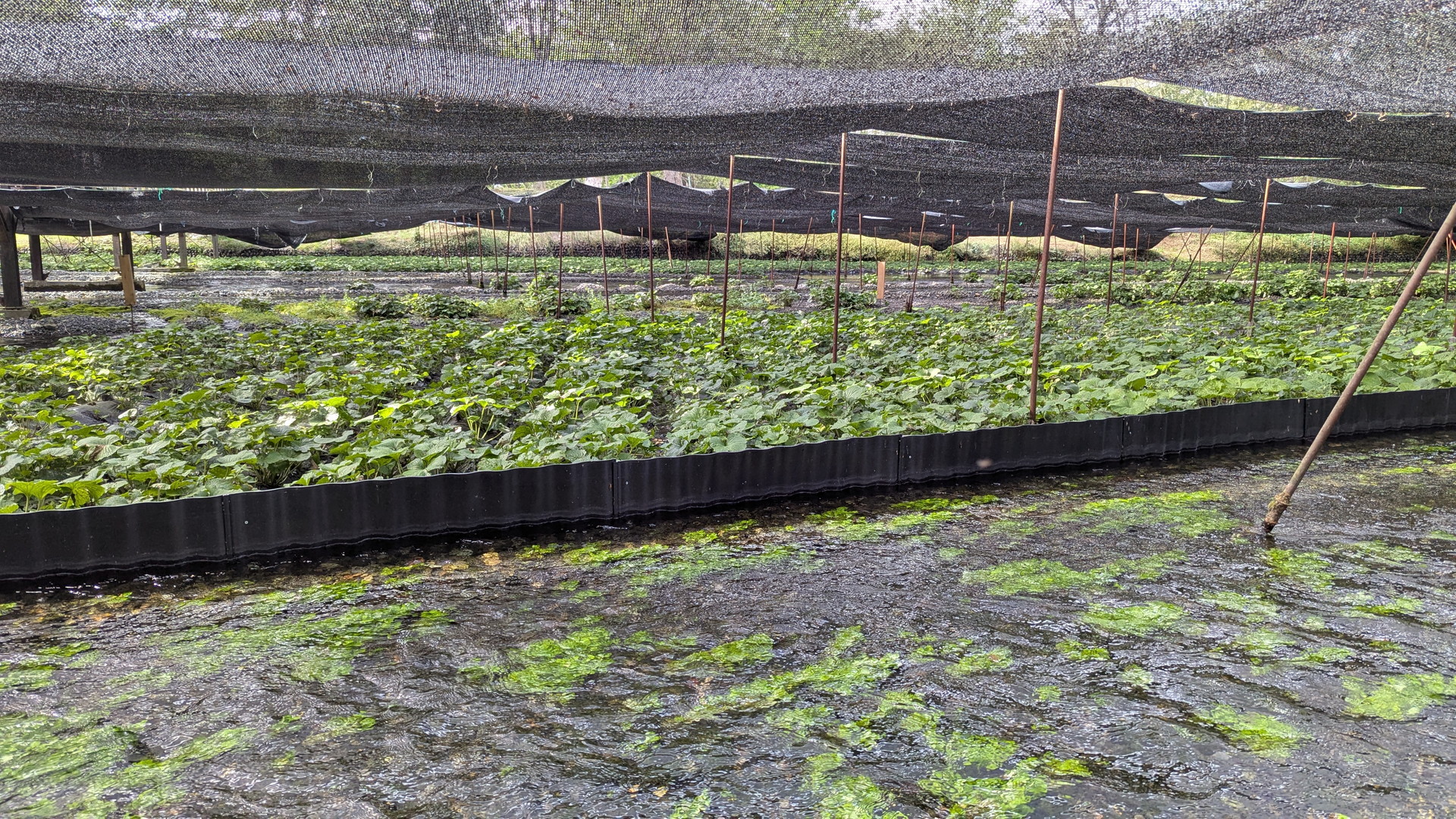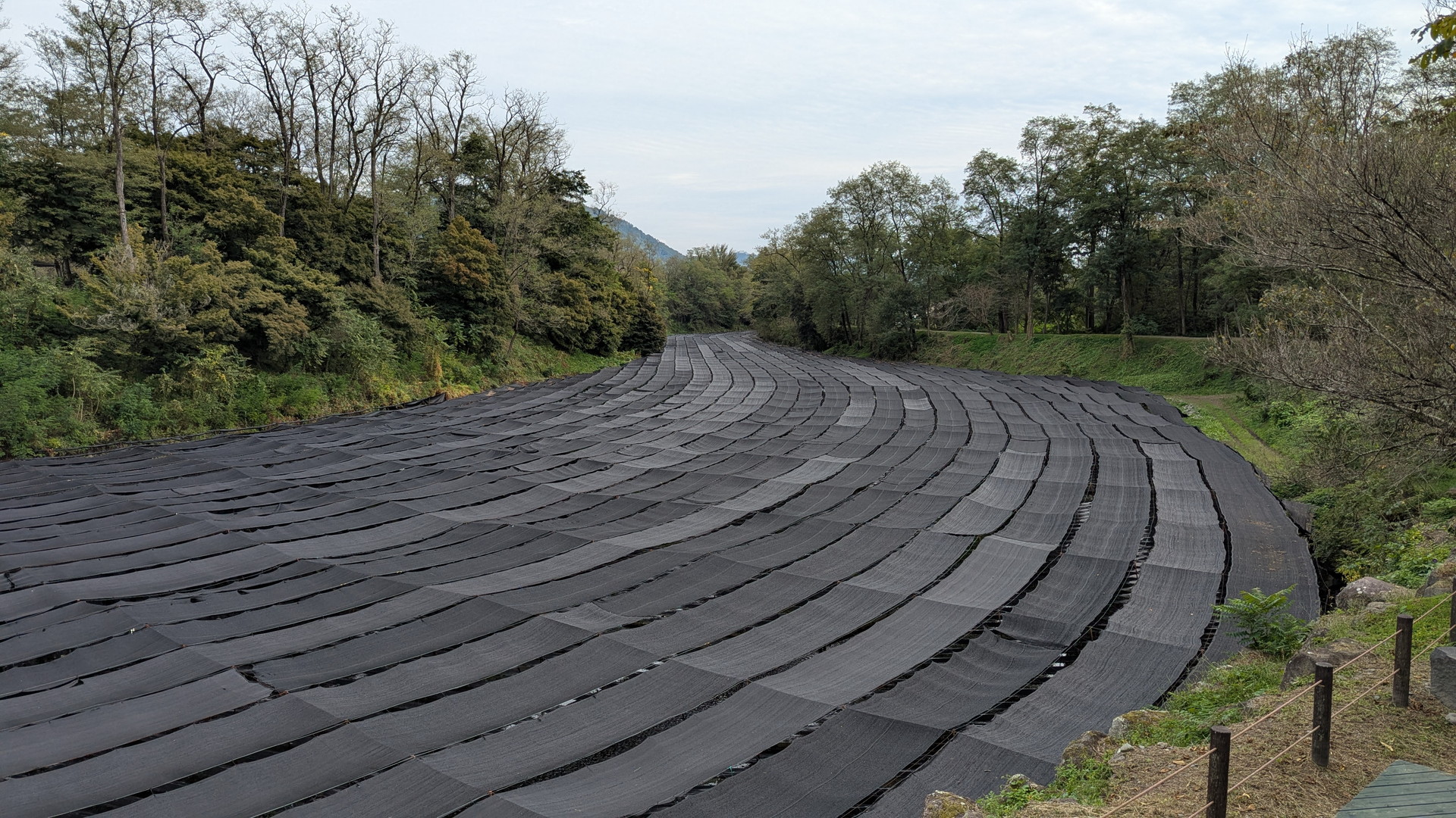 橋を渡ったところに階段があって、そこを下りると日よけの下でわさびが栽培されている様子を見ることができました。