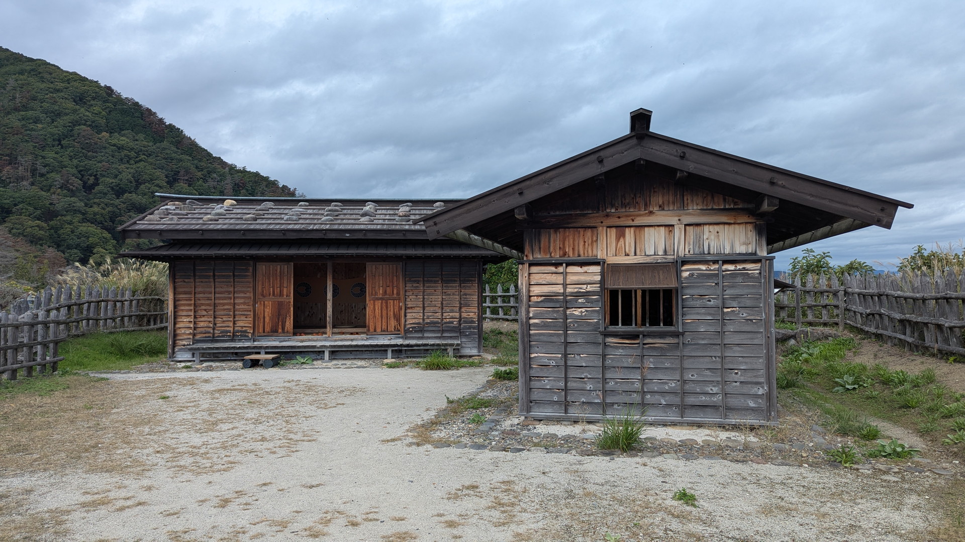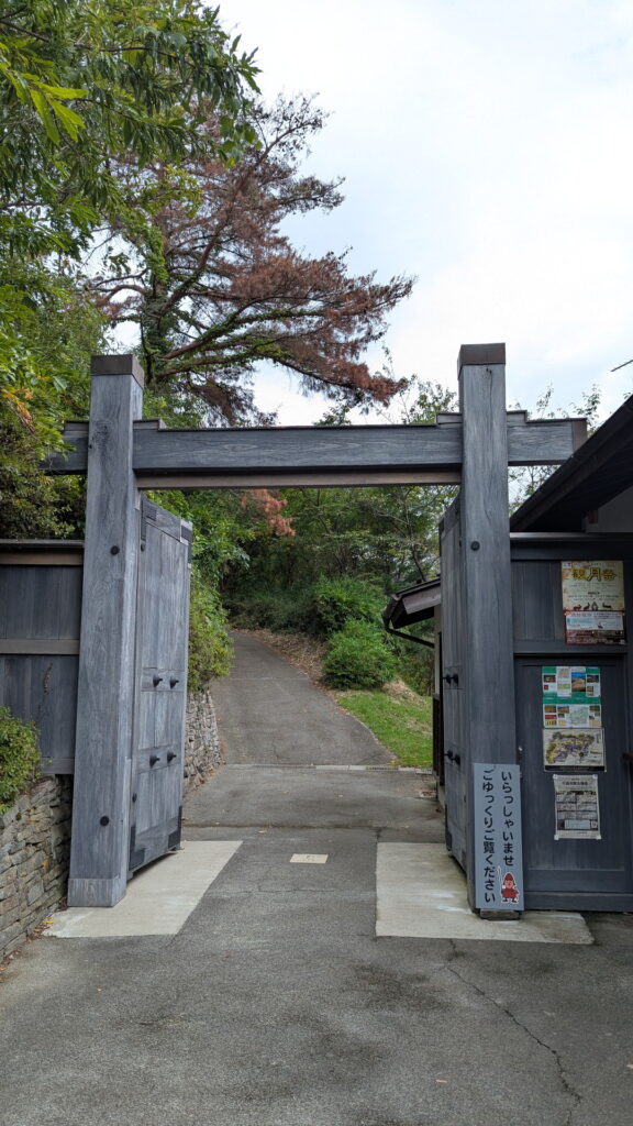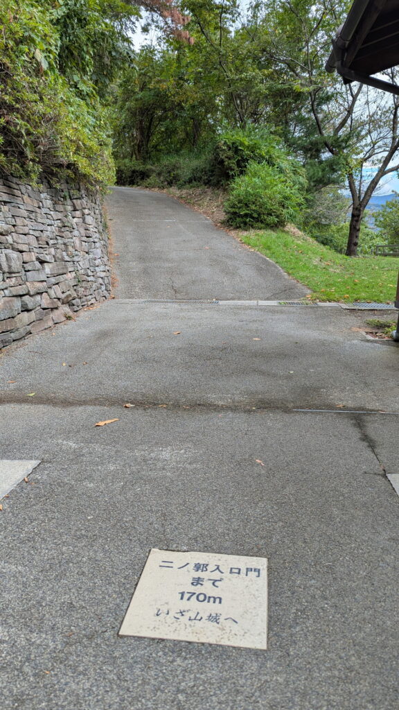 手前にある建物が資料を展示していたところ、左手前が坂道を上がってきたところにある見張り台が付いた門、奥に本廓が見えています。