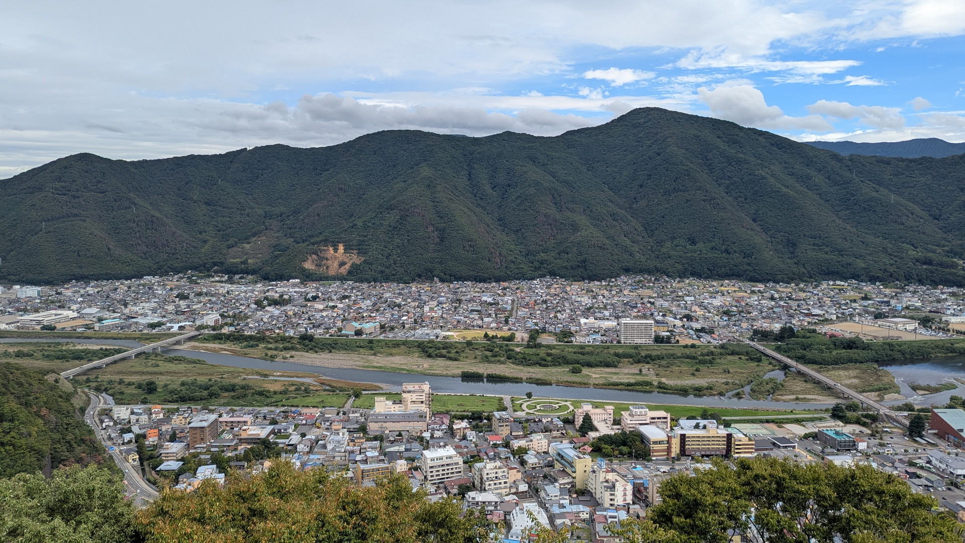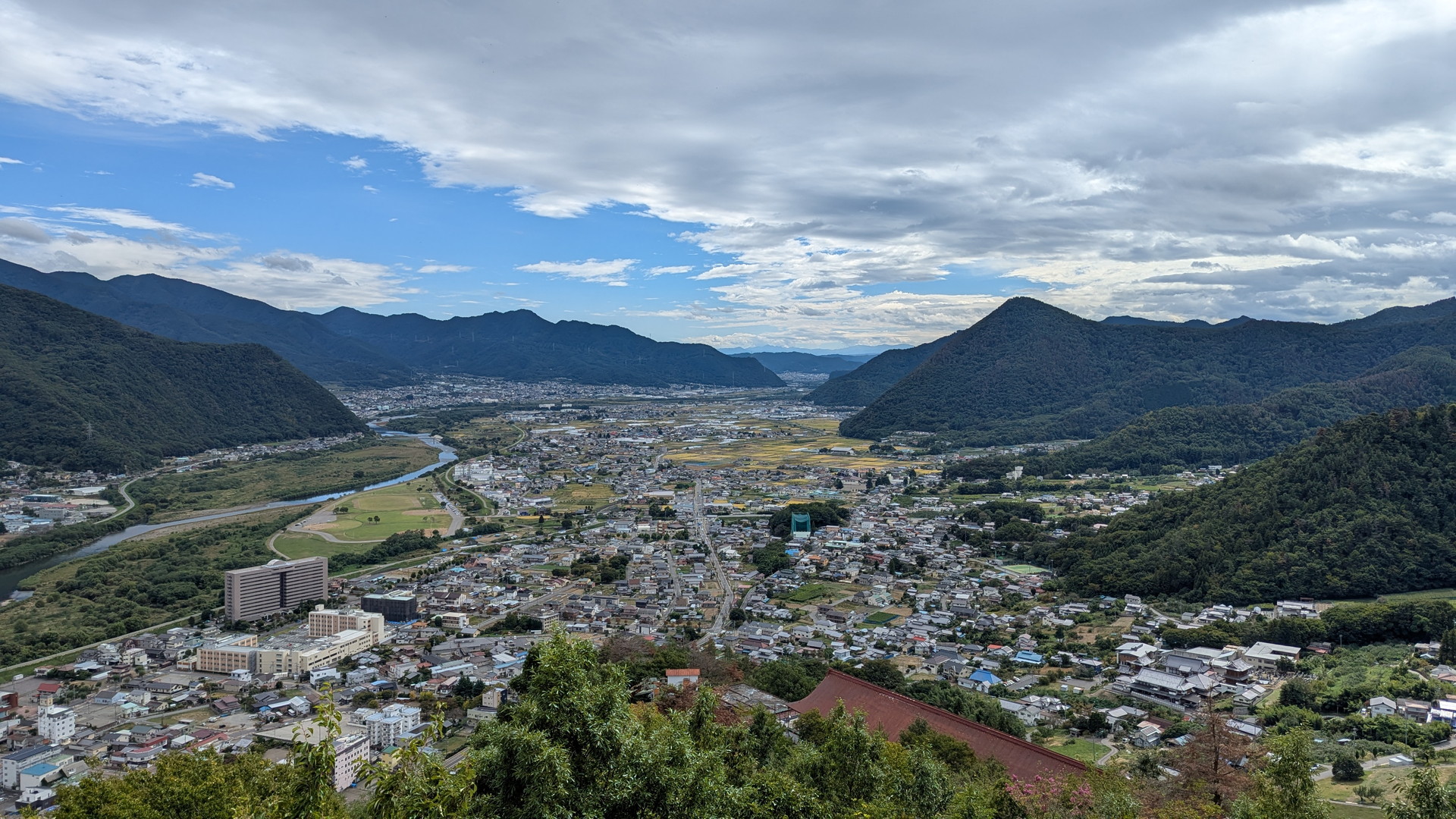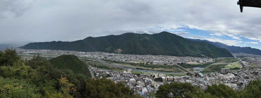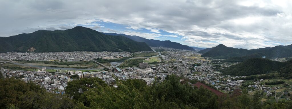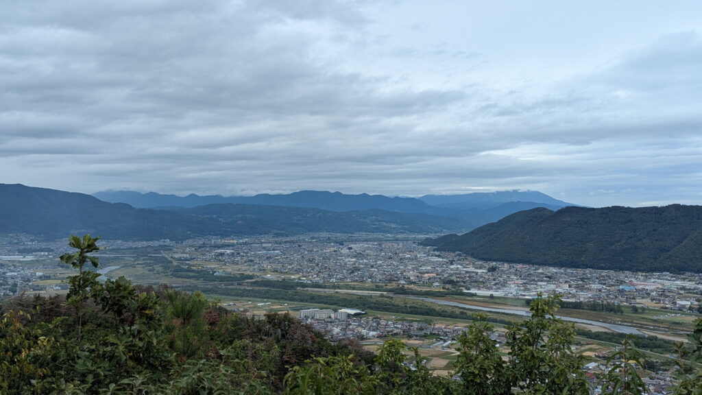 手前はさっきまでいた上山田温泉街で、その向こうが千曲川と千曲市街。