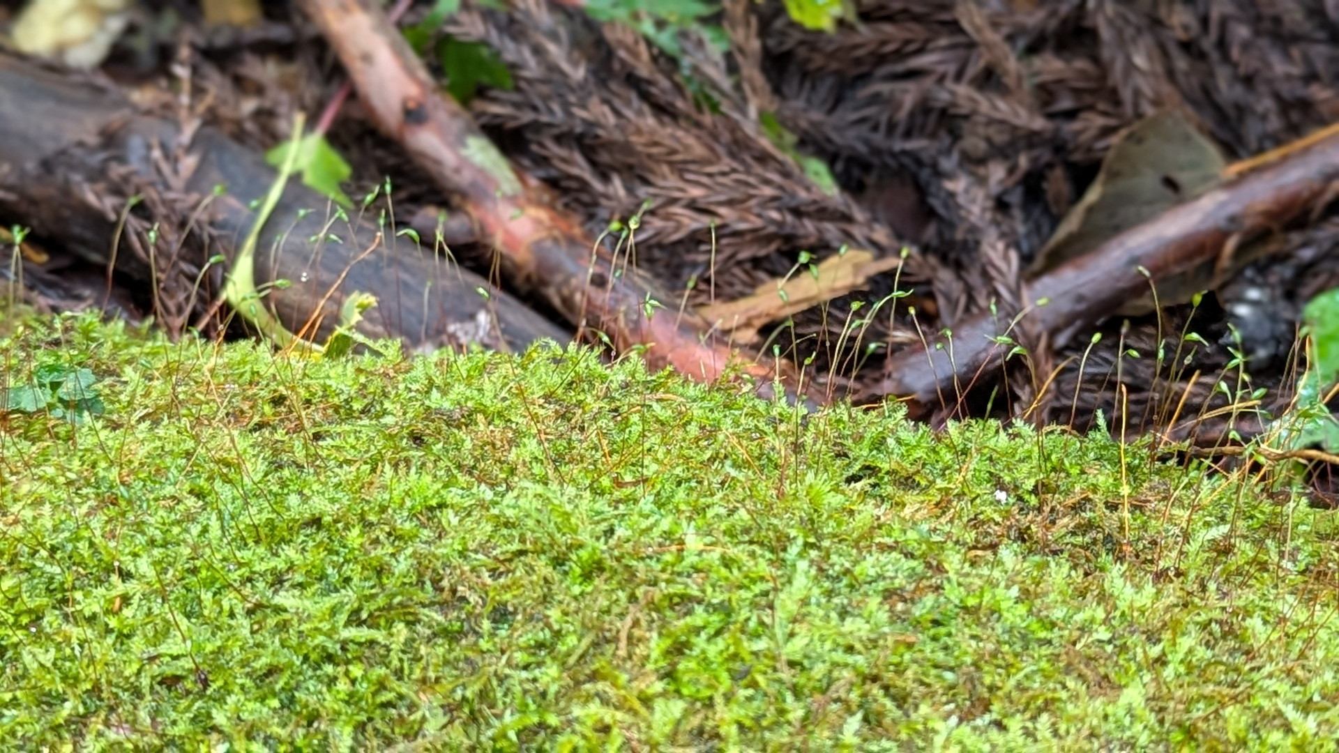 参道脇の倒木には苔が生えています。