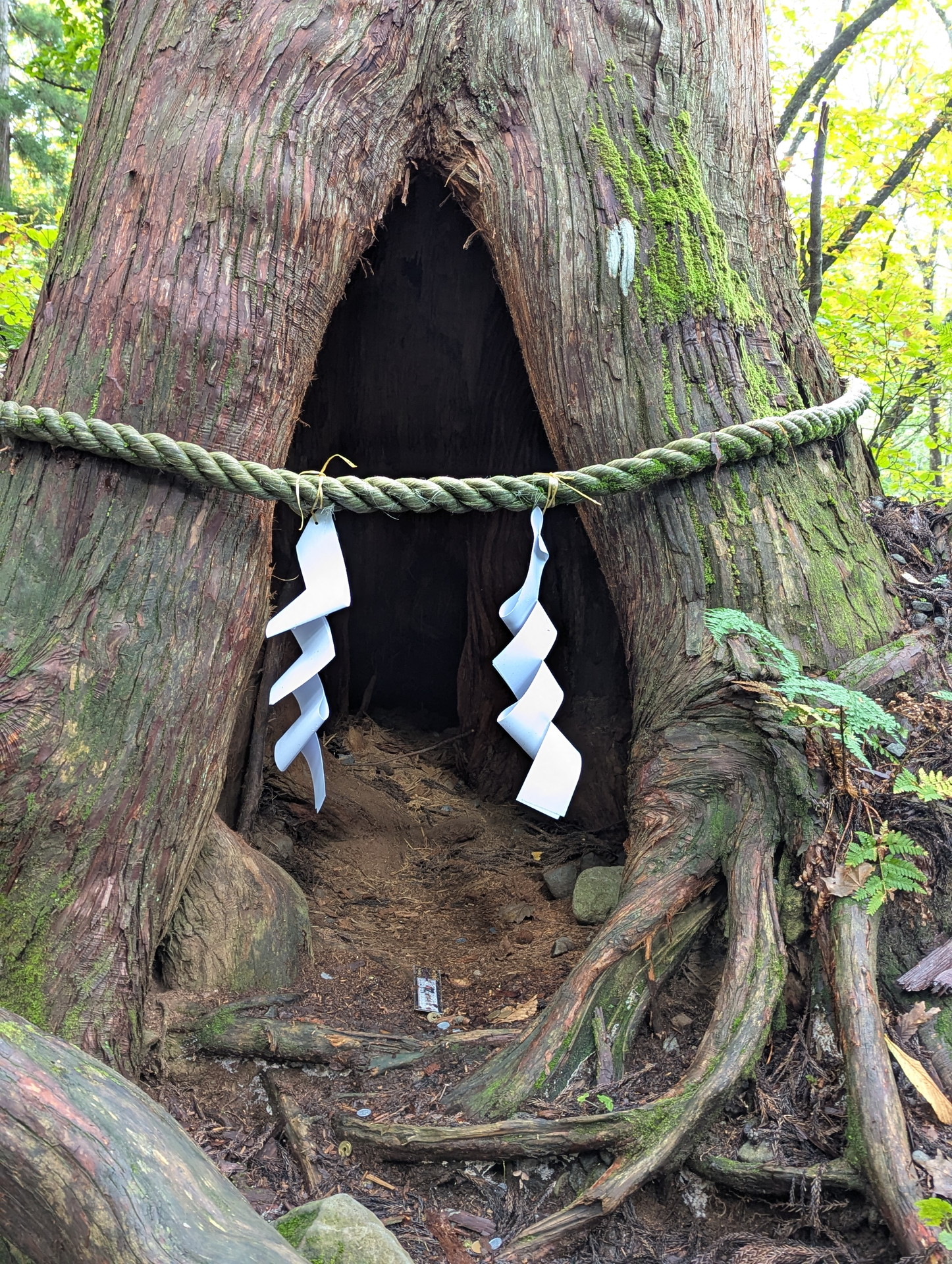 木の幹に穴が開いていてしめ縄が巻いてあって、お守りも置いてあるのですが、ここは何なのでしょうか?