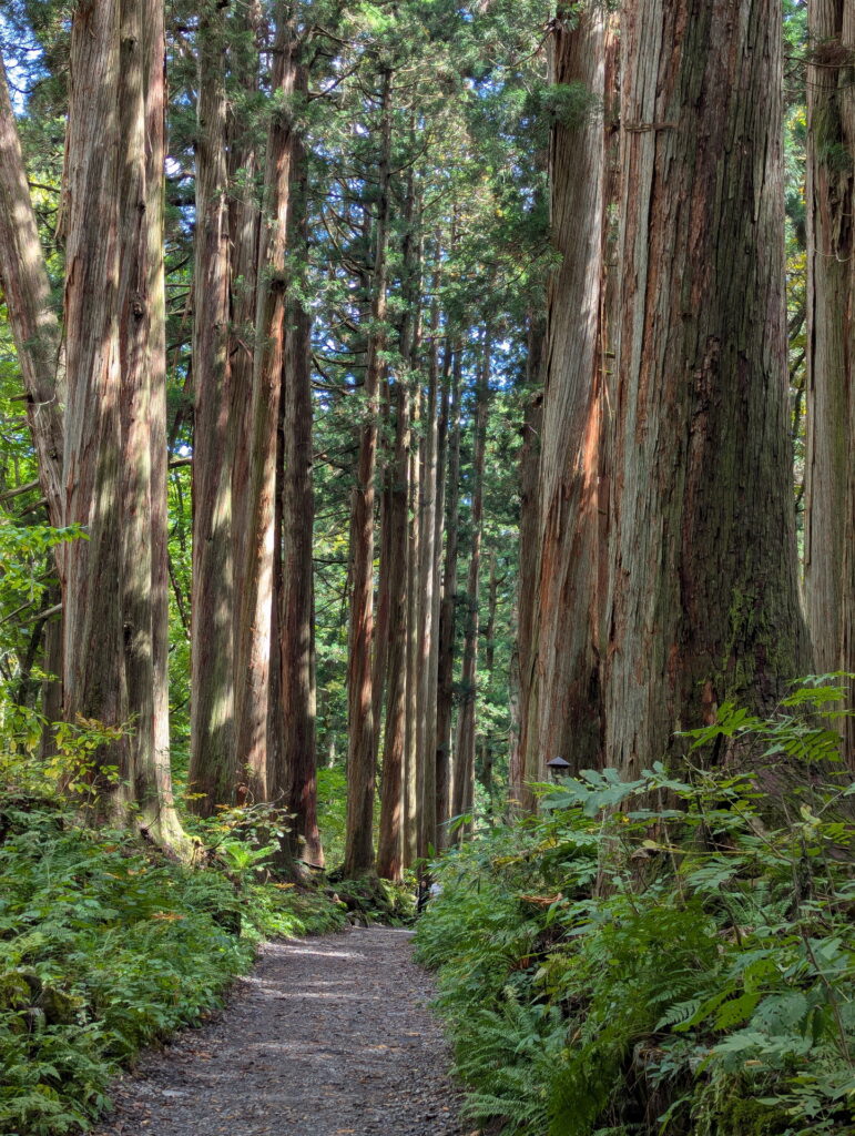奥社・九頭龍社へ向かう参道はおよそ2kmあって、戸隠山の自然と信仰が融合した、まさに“聖なる道”です。参道の途中にある随神門をくぐると、そこから先は樹齢数百年の杉並木が参道両脇に立ち並び、その荘厳さは戸隠を象徴する風景です。長い参道を進み、山を背に構える社殿に辿り着いたときの静寂と迫力は、まさに“聖域に至る”という言葉がふさわしい佇まいです。