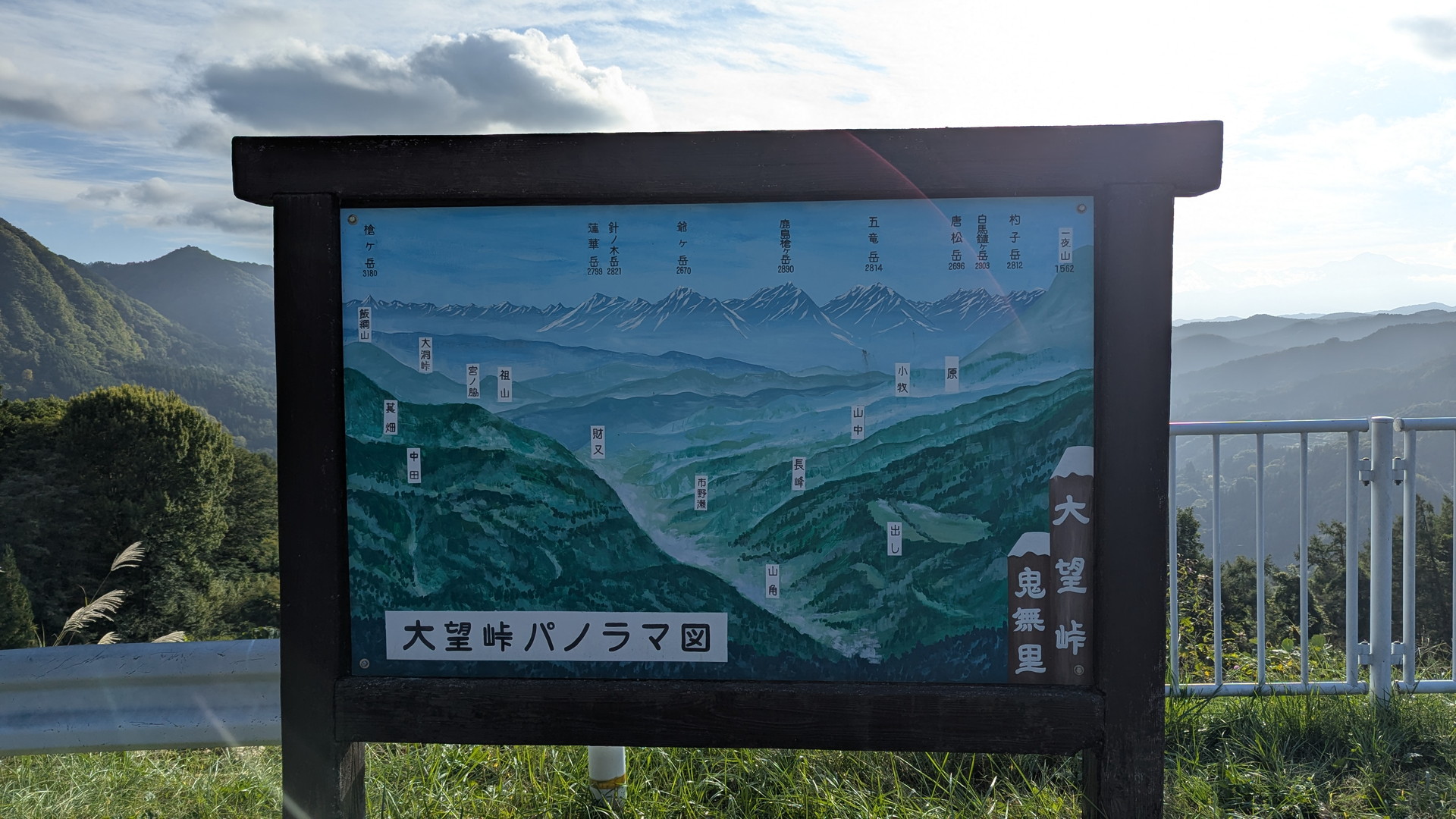 「大望峠展望台」は、長野市の北部、小川村との境に近い山あいに位置する展望峠で、北アルプスの大パノラマを一望できることで知られる絶景スポットです。標高約1,055メートルの峠からは、天候に恵まれれば白馬三山や後立山連峰など、雄大な山並みが眼前に広がります。