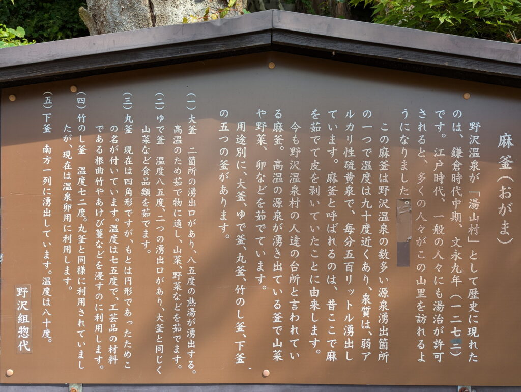 「麻釜」は複数の源泉が集中していて、湧出する温泉の温度は約90℃になる共同の源泉場で、その名は麻を茹でて柔らかくしたことに由来するといわれています。