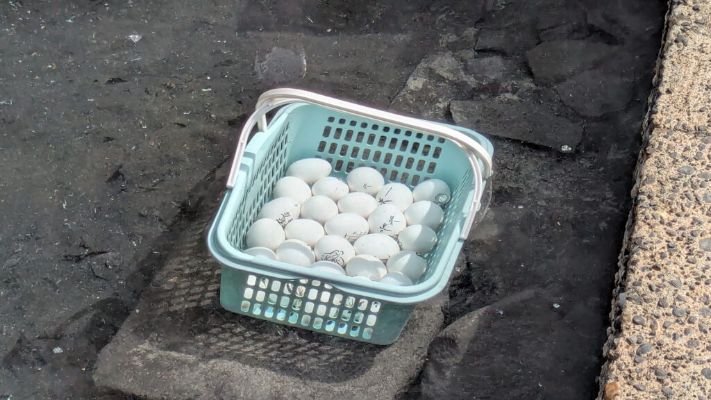 カゴに入った白いものは野沢温泉名物「温泉たまご」