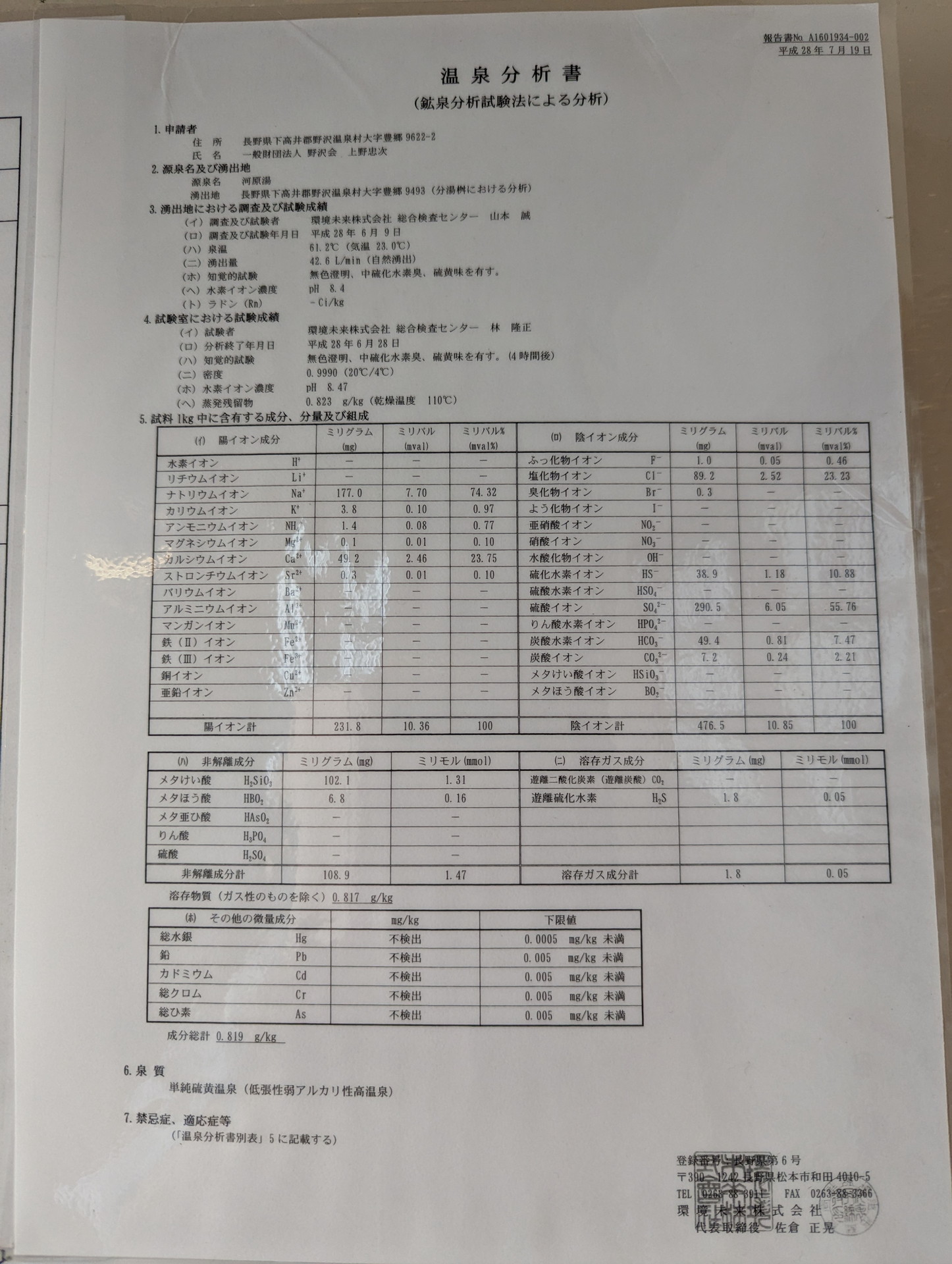 野沢温泉 真湯 温泉分析書