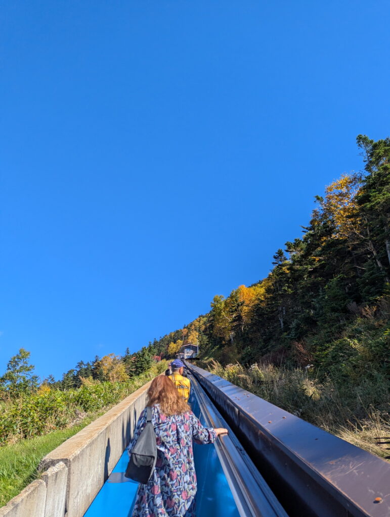 屋外に設置された全長約200mのベルトコンベア式の動く歩道に乗って、ゆったりと斜面を登っていきます。